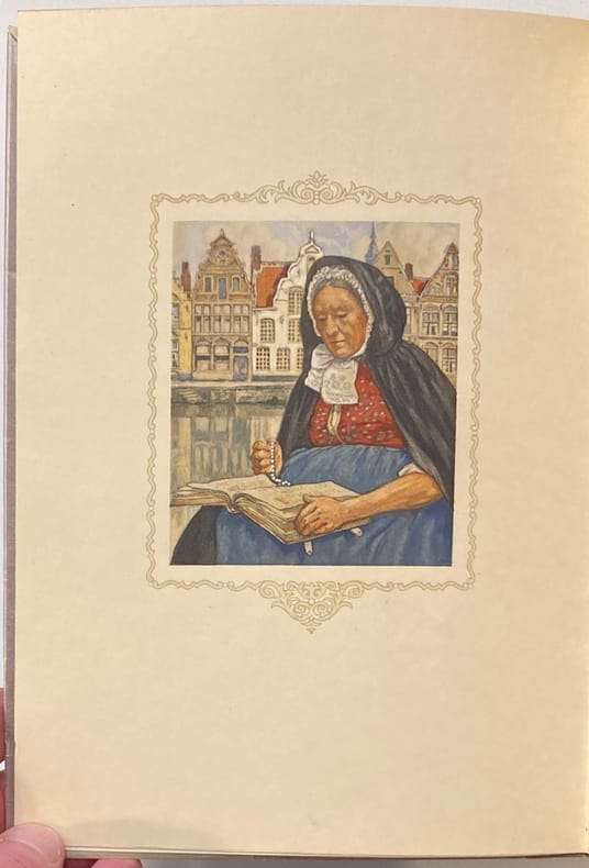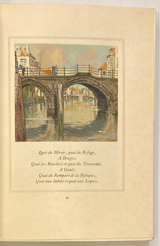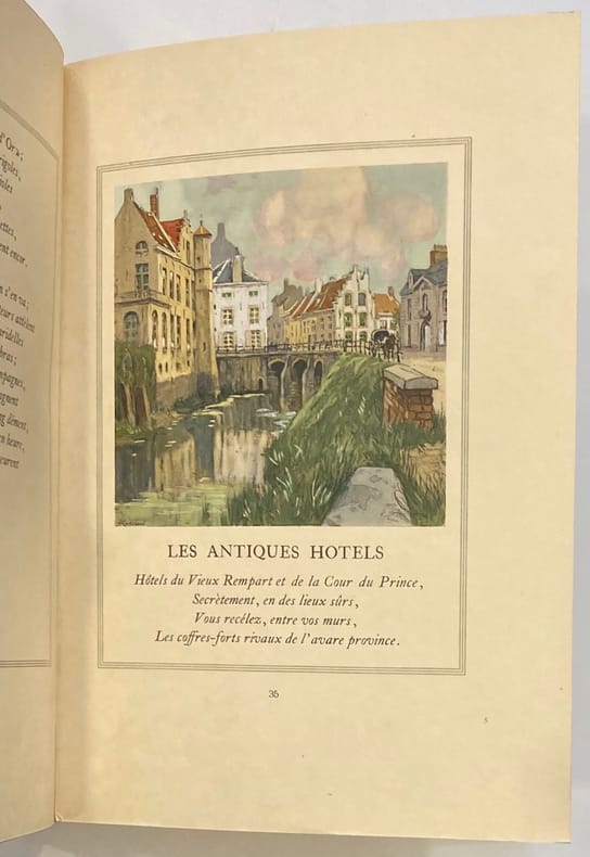 14. Le Vésinet (Agglom. Paris), Victor Dancette, 1946, in-4°, 33,5 x 26 cm, 124 pp avec 35 gravures coloriées (10 à pleine page, 25 à demie page), en feuilles libres, avec couverture souple et une chemise en demi-toile dans un emboitage. Un des 220 exemplaires sur velin d'Arches (après 30 exemplaires du tirage à tête). Emboitage un peu décolorié, mais bel exemplaire. Belle édition richement illustrée avec des gravures en couleurs de Julien Célos (1884 - 1953). Les gravures évoquent une Flandre douce et paisible d'avant la Première Guerre Mondiale, et correspondent ainsi parfaitement avec le texte du poète flamand Emile Verhaeren, qui publiait cette collection poétique '' Les Villes à Pignons'' pour la première fois en 1910.