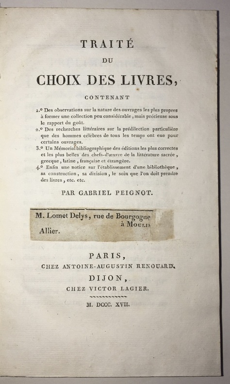 Edition originale. En réalité il s'agit d'une édition entièrement refondue du Traité du choix des livres qu'il avait fait paraître en 1817. C'est certainement l'un des tout premiers traités qui définissent la bibliophilie au sens moderne du terme.