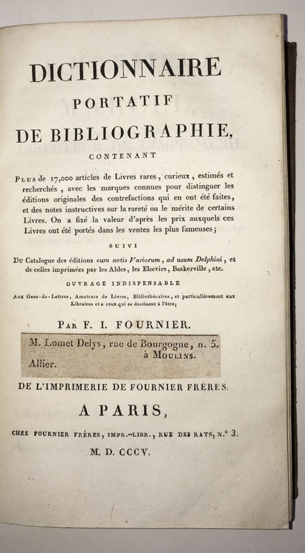 Cet ouvrage traite : De la nature des ouvrages les plus propres à former une collection peu considérable, mais précieuse…Des prédilections particulière que des hommes célèbres de tous temps ont eue pour certains ouvrages. Des éditions les plus correctes et les plus belles.De l’établissement d’une bibliothèque…«Ce n’est point dans le nombre de volumes que consiste l’excellence d’une bibliothèque, mais dans le choix et le mérite des ouvrages qui la composent». Tirage à 750 exemplaires. Relié à la suite : FOURNIER. Dictionnaire portatif de bibliographie, contenant plus de 17 000 articles de livres rares, curieux, estimés et recherchés…Paris. Fournier Frères. 1805. (2) ff. ; II pp. ; VIII pp. ; 404 pp. ; (1) f. Ex-libris sur les pages de titre M. Lomet Delys à Moulins.