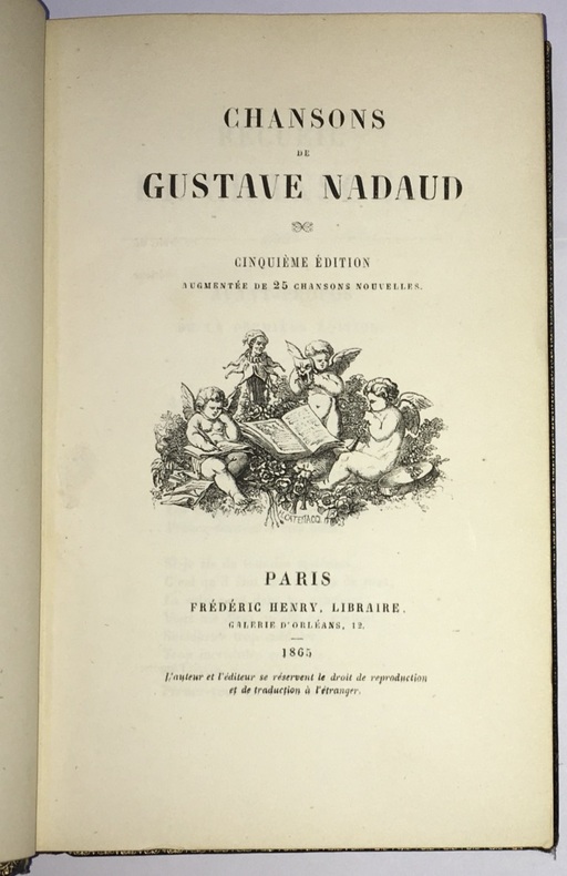 Cinquième édition, en partie originale, augmentée de 25 chansons nouvelles. Recueil de morceaux populaires, drôles, ironiques, engagés et parfois satiriques comme Le Roi boiteux, satire politique du Second Empire. Certaines de ces chansons seront interdites par le régime, et d’autres autorisées seulement sous la Troisième République. Gustave Nadaud est un poète français et l’un des seuls chansonniers de l’époque à écrire lui-même ses textes et à les mettre en musique.Bel exemplaire. Vicaire, VI, 9.