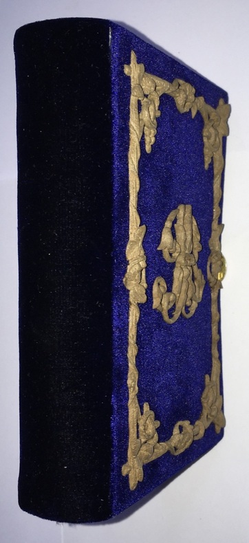 1850 1850 Paris. Belin-Leprieur et Morizot, L. Curmer. [vers 1850]. 1 volume in-12, velours bleu nuit, plats ornés d'un cadre ornemental de bois sculpté, chiffre de même au centre du premier plat, dos lisse muet, fermoir de métal doré, doublure et gardes de moire beige clair.(8) ff. ; 382 pp. ; (1) f.