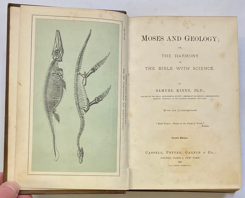 Second edition illustrée d'un frontispice, de 16 planches et de 93 figures in-texte.Kinn's work endeavoured to show that the account of the Creation in Genesis harmonised with the latest scientific discoveries. His work was very popular, being published in fourteen editions in as many years, this second edition published only three months after the first. A nice copy.Bookplate of Craigmont High School, Edinburgh.Infimes rousseurs.