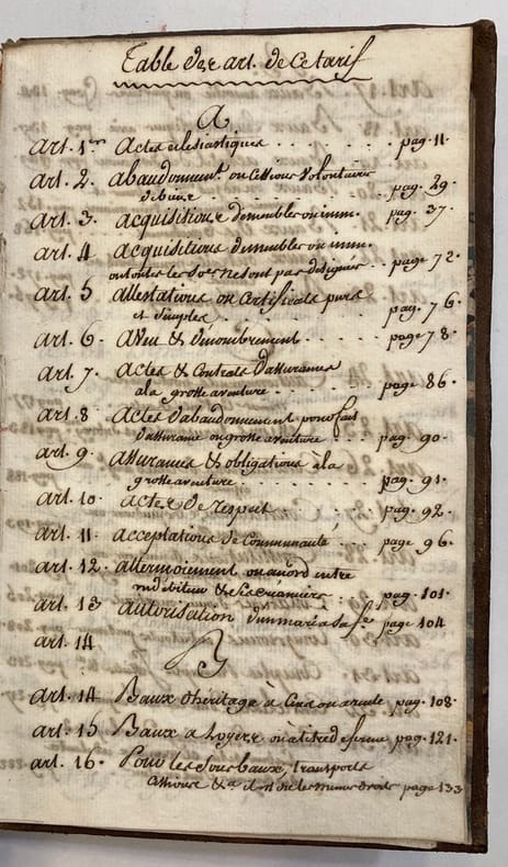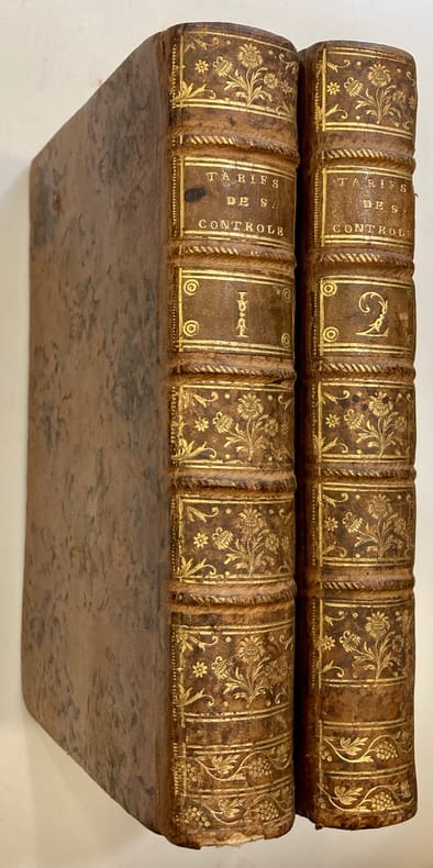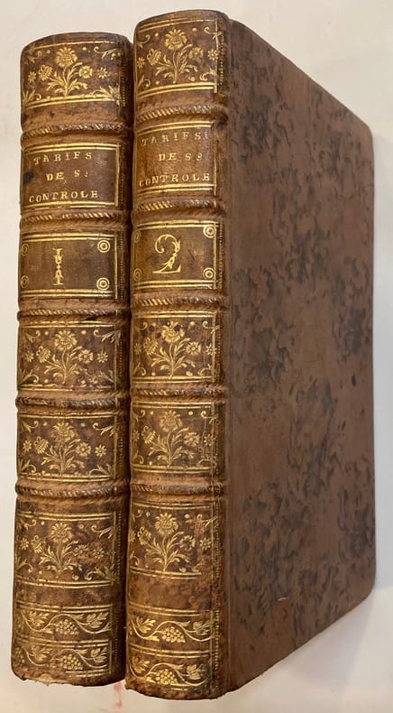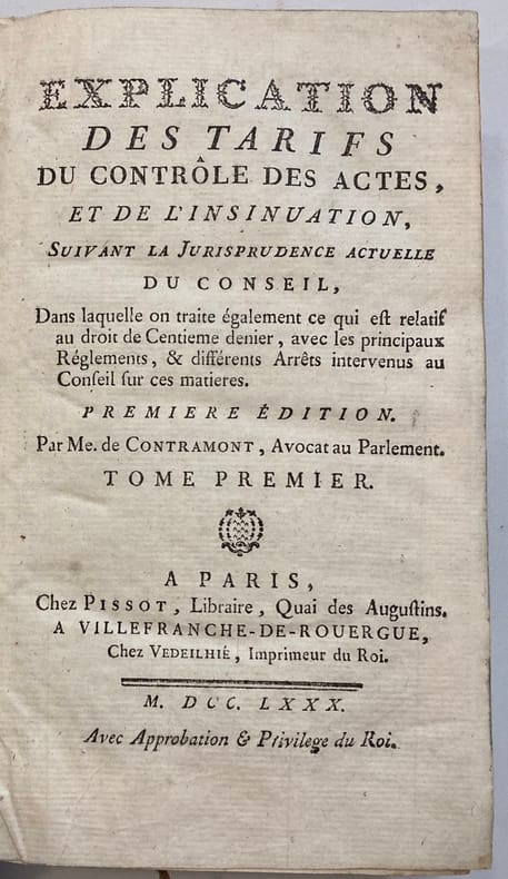 Première édition.Avocat au Parlement de Lyon et de Paris, l’auteur a pour louable intention de mettre les “Redevables en état de défendre leurs droits vis-à-vis du Percepteur et de ne payer que ce qu’ils doivent légitimement…”. Le premier tome concerne le contrôle des Actes des notaires et Insinuations laïques, avec articles concernant les baux, les contrats de mariage, d’usufruit, les droits de transport (voiturier), inventaires… Le second tome présente des Edits, Déclarations et Arrêts du conseil d’état du Roi. Rare impression de Villefranche-de-Rouergue. A la fin du tome 1, sont reliées 8 pages de tables manuscrites.