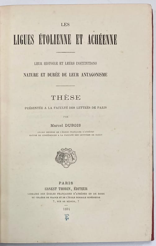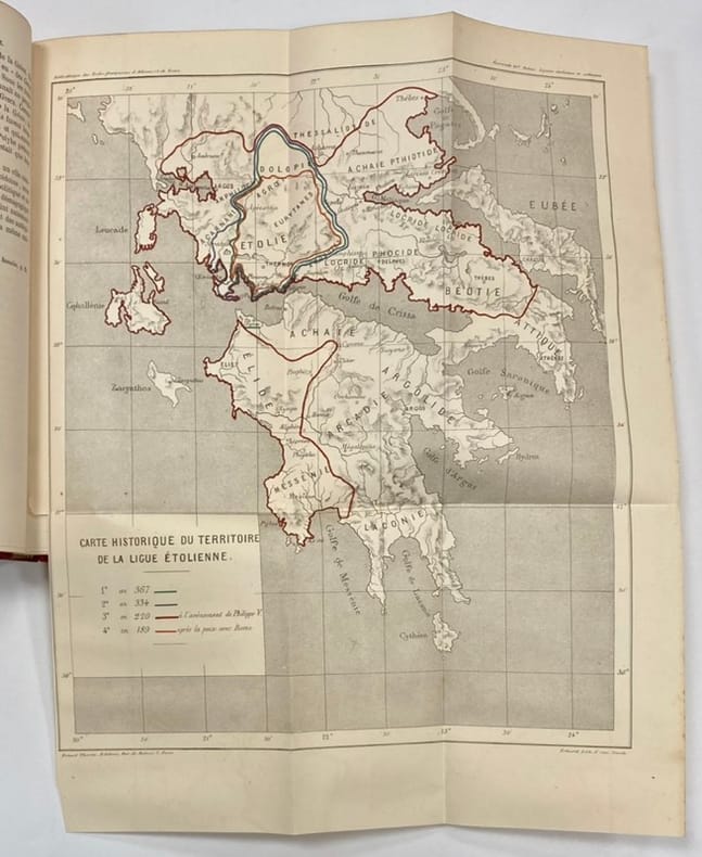 Édition originale illustrée de deux cartes dépliantes avec des tracés de couleur. L’histoire de deux confédérations de cités grecques, constituées au IVème siècle avant J.-C. pour se libérer de l’emprise de la Macédoine. Malgré un fonctionnement novateur, elles seront anéanties à l’avènement de l’Empire romain et deviendront le symbole des dernières luttes de la Grèce antique pour la liberté. Thèse présentée à la faculté des lettres de Paris. Ex-libris “Bibliothèque de la Tremblaie”.