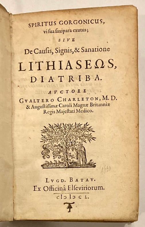 Edition originale.Très rare premier ouvrage de Walter Charleton (1619-1707) sur l'origine et le traitement des calculs. Célèbre médecin anglais admiré pour sa précocité, il fut nommé médecin ordinaire du roi Charles I à l’âge de 23 ans. Si on ne lui doit guère de découvertes originales, il fut cependant l’un des premiers partisans de la nouvelle théorie de la circulation sanguine défendue par son contemporain William Harvey. Dans le présent ouvrage consacré aux lithiases, il attribue la formation des calculs “à la combinaison des particules terrestres et salines… Quant aux remèdes, il les cherche dans la chimie, et surtout dans les écrits de Van Helmont, d’où il a tiré les graines de carotte sauvage et le suc de bouleau…” Un coin restauré. (Leclerc Biographie médicale p. 449). DNB III, 208: “[A work] in which he ascribed the formation of stones in the human body to a stone-forming spirit”. Dezeimeris I, 671.
