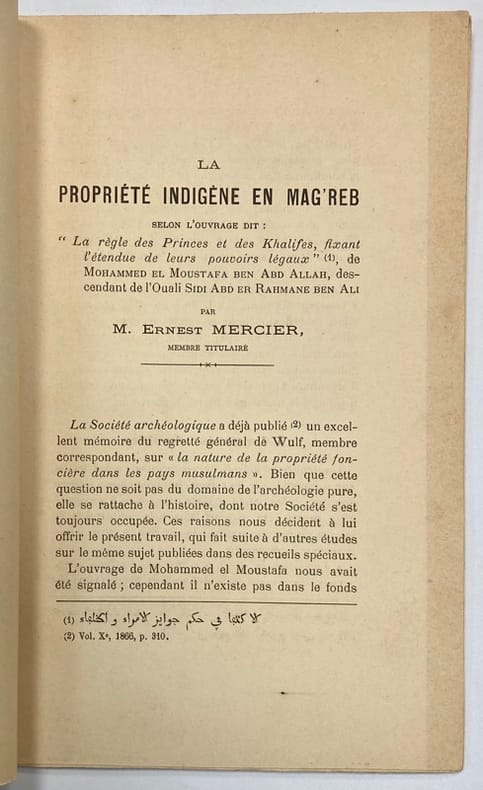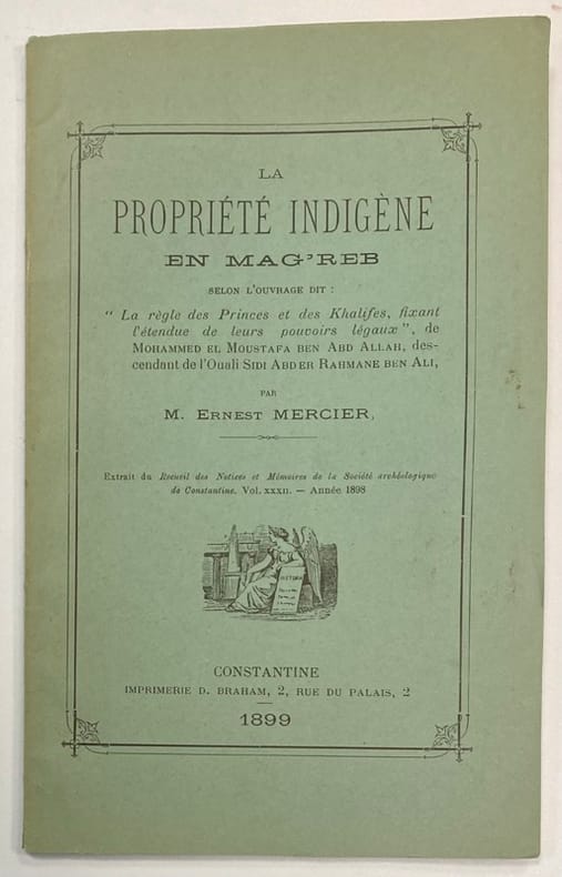 Interprète-traducteur de l’arabe et maire de Constantine à partir de 1883, Ernest Mercier se passionna dès son arrivée en Algérie pour l’histoire du pays. Cette publication est un extrait des Notices et Mémoires de la Société archéologique de Constantine, de 1898, dont l’auteur fut par ailleurs vice-président. Mercier s'appuie sur l'ouvrage : “La règle des Princes et des Khalifes, fixant l’étendue de leurs pouvoirs légaux”, de Mohammed El Moustafa ben Abd Allah, descendant de l’Ouali Sidi Abd er Rahmane ben Ali. Ex-libris Pierre Libaude.