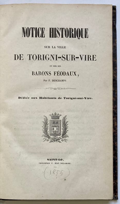 Edition originale.François Deschamps (1794-1868), natif de Torigni-sur-Vire (Manche), fut médecin et maire de la ville. L’ouvrage, rédigé à la demande de Napoléon III en “compensation” de fonds octroyés pour la restauration de l’Hôtel-de-ville et d’une collection de tableaux offerte par le prince Honoré V de Monaco, est particulièrement intéressant pour les liens unissant cette petite ville normande et les Matignon-Grimaldi. Frère I, 343.