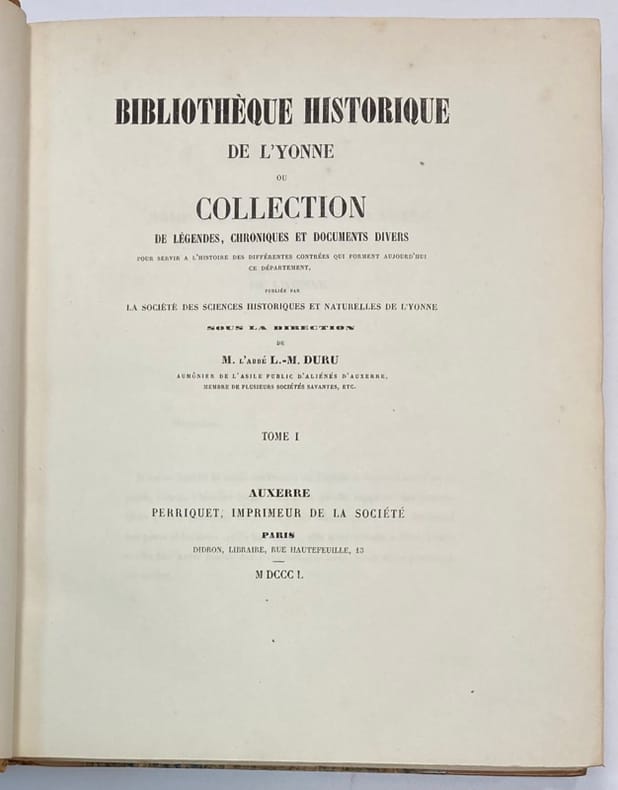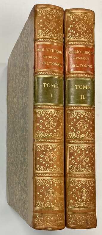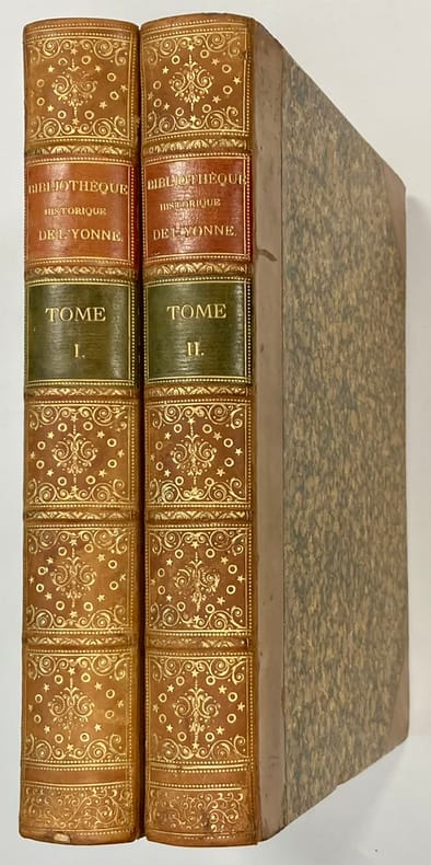 1850 Auxerre. Perriquet, imprimeur de la Société, puis Perriquet et Rouillé et Paris. Didron. 1850 - 1863. 2 volumes in-4, demi-veau blond à coins, dos à nerfs ornés, pièces de titre et de tomaison rouges et vertes. Minime accroc à la coiffe inférieure du tome 1. LI pp. ; (1) p. bl. ; 579 pp. ; (3) pp. - XXVIII pp. ; 669p. ; (3) pp.