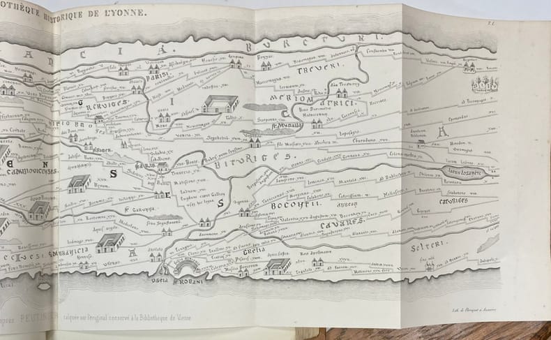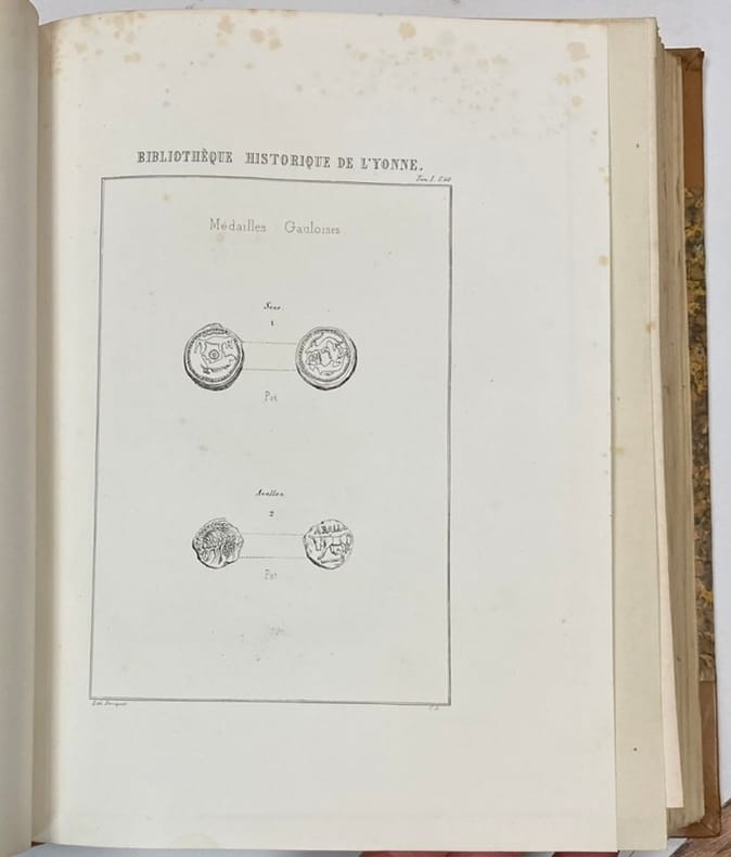 Editions originales. Le tome 1 est illustré de 4 planches dont 2 de monnaies, 1 carte dépliante de la Gaule d’après Peutinger, et 1 facsimilé en couleurs.Une compilation par ordre chronologique des documents anciens relatifs à l’histoire du département de l'Yonne, de l’époque romaine au XIIème siècle. Dans l’introduction du second volume, l’auteur mentionne la préparation d’un “dernier volume…[qui] renfermera la table chronologique des faits de l’histoire locale, la table générale des matières, les errata, etc.” qui semble n’être jamais paru. Les documents rassemblés sont imprimés dans leur langue d’origine, généralement en latin, et en français pour les plus récents. Il est mentionné une liste de planches du T. II, qui ne sont pas présentes mais semblent toujours manquer. Infimes rousseurs.