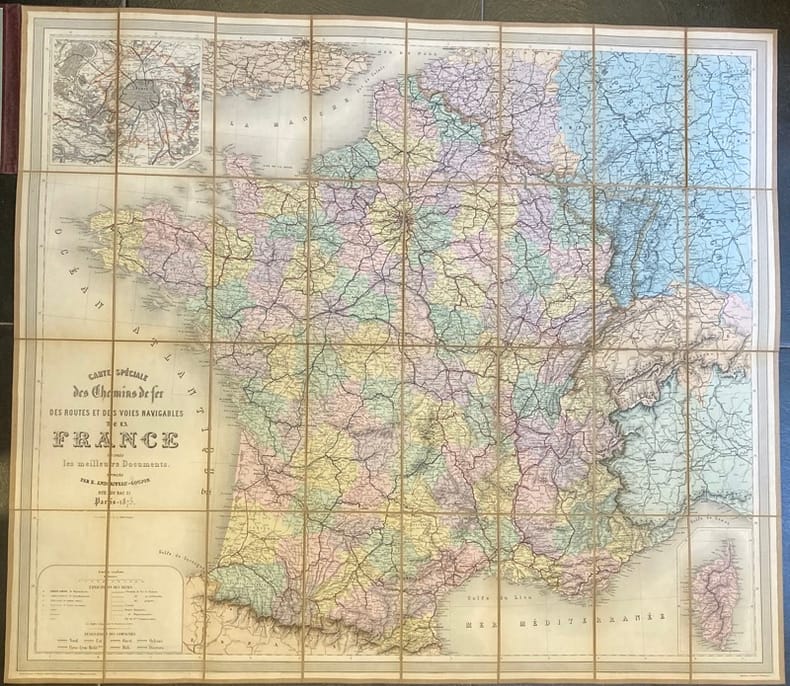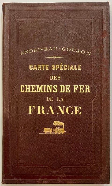 1875 Paris. Andriveau-Goujon. 1875. Carte entoilée de 96,5 x 83,5 cm, repliée en 32 sections, sous chemise en percaline lie-de-vin estampée à froid et dorures, légèrement frottée.