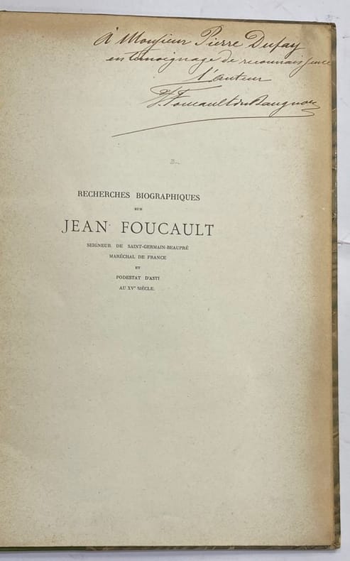 Opuscule tiré seulement à 60 exemplaires, celui-ci enrichi d'un envoi autographe de l'auteur à Pierre Dufay, au faux-titre. Il s'agit d'une enquête de l'auteur sur son ancêtre Jean Foucault, qui fut compagnon de Jeanne d'Arc, maréchal de France et Podestat d'Asti au XVe siècle.Quelques rousseurs.