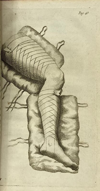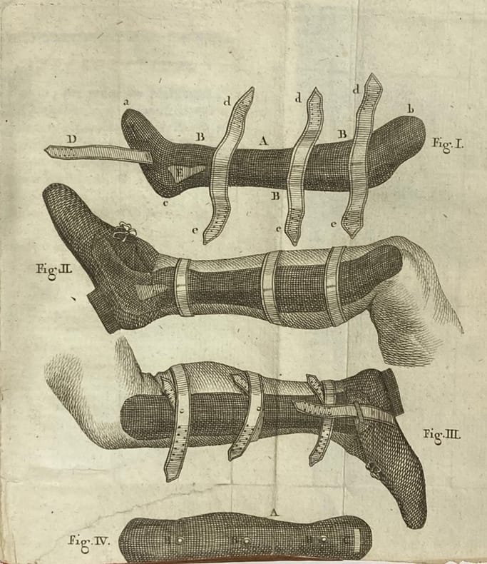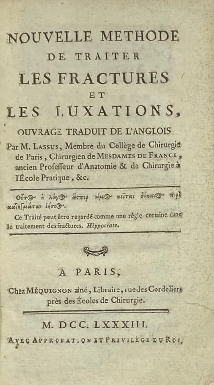 Édition traduite en français par M. Lassus, originellement parue en anglais en 1768. L'ouvrage est illustré de 2 planches gravées dont 1 dépliante. Pott développe ici une nouvelle méthode de réduction des fractures en recherchant la position de relaxation maximale des muscles.Chirurgien à l'hôpital St. Bartholomew de Londres, Percival Pott (1714-1788) est l'un des fondateurs de l'orthopédie. Il fut par ailleurs le premier à démontrer l'influence de l'environnement sur le développement des cancers, en étudiant leur occurrence chez les ramoneurs.1 mors fendu, reliure légèrement frottée.