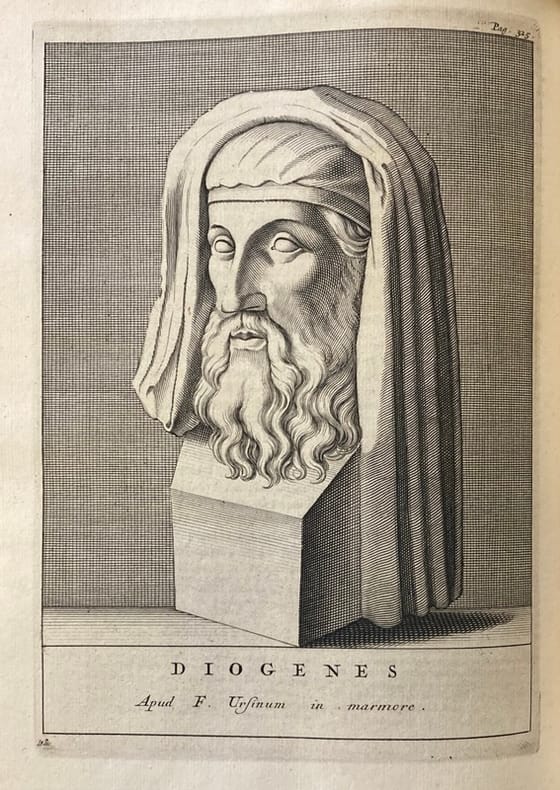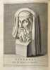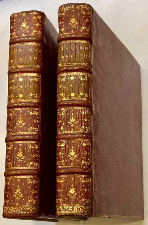 Selon Brunet, "édition la plus complète et la plus belle que l'on eût alors de cet écrivain." Elle est imprimés sur 2 colonnes et est illustrée d’un frontispice et de 25 planches.Le premier tome, en édition bilingue latin/grec, contient la vie des principaux philosophes grecs (Platon, Thalès, Euclides, Socrate, Pythagore…), orné de leur portraits à pleine page. Cet ouvrage est annoté par Isaac et Méric Casaubon ainsi qu’Aldobrandini. Le second tome contient les observations de Gilles Ménage et Joachim Kühni.Coiffes frottées au tome I avec petit accroc à la coiffe supérieure, petit trou de vers en bas du dos du tome II.Bel exemplaire relié en plein maroquin rouge. Brunet II n°720.