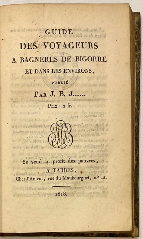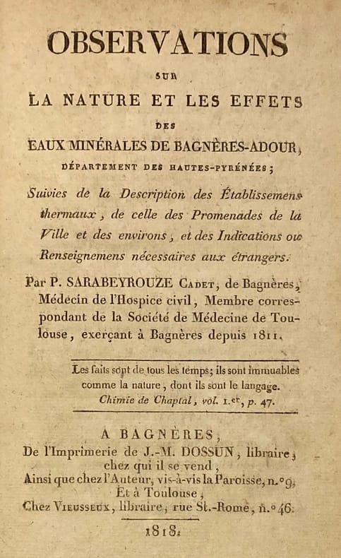 Relié à la suite :(JOUDOU. J.B).Guide des voyageurs à Bagnères de Bigorre et dans les environs.Tarbes. Chez l’auteur. 1818. (1) f. ; VI pp. ; 163 pp. ; (3) pp.Editions originales. Réunion de deux ouvrages rares. Dendaletche (n°1668) commente ainsi l’ouvrage de Sarabeyrouze: “Bon connaisseur du thermalisme pyrénéen et de son histoire réelle...Un des livres majeurs sur le sujet.” L’auteur relate nombreux cas cliniques soignés par différentes sources et renseigne ensuite sur les établissements thermaux de la ville et ses promenades. Signature autographe de Sarabeyrouze au dos du faux-titre du premier ouvrage, sceau de la Mairie de Bagnères au dos du titre du second. Petit accroc avec manque de quelques lettres pages 113-116, du premier ouvrage.
