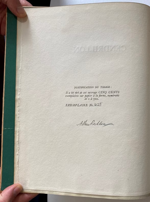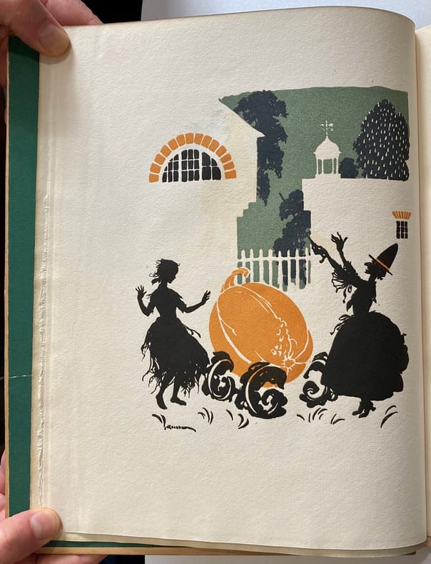 Le conte de Cendrillon, transcrit en cyrillique sur les gardes, est retracé dans les 4 planches à colorier : à gauche, la planche en couleurs, à droite, celle en sépia. On voit Cendrillon nourrissant les oiseaux, au bal avec le prince, le prince éperdu devant le vêtement de Cendrillon, les serviteurs du prince la reconnaissant et lui enfilant la pantoufle de vair. Les costumes s'inspirent de la Renaissance. Annotations manuscrites à la garde inf., dos débroché.