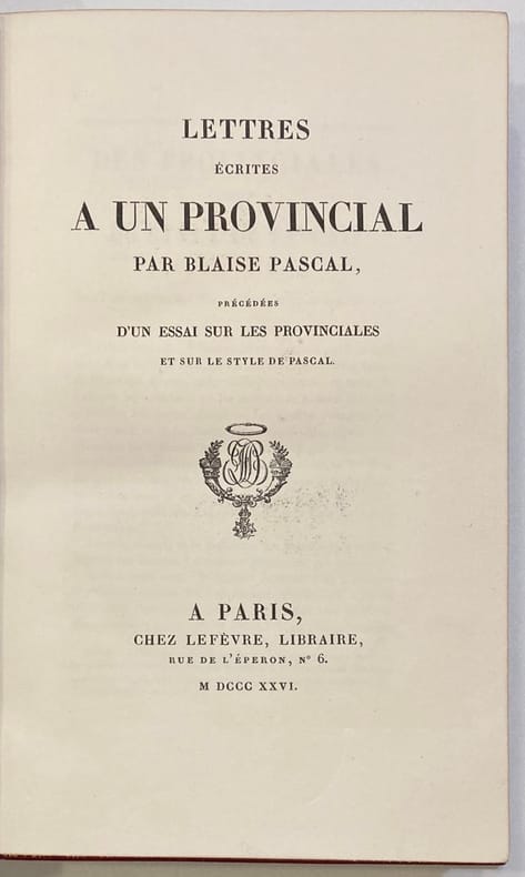 Illustré d'un portrait-frontispice de l'auteur. Ouvrage précédé d'un Essai sur les Provinciales et sur le style de Pascal par François de Neufchateau. Très bel exemplaire parfaitement relié.
