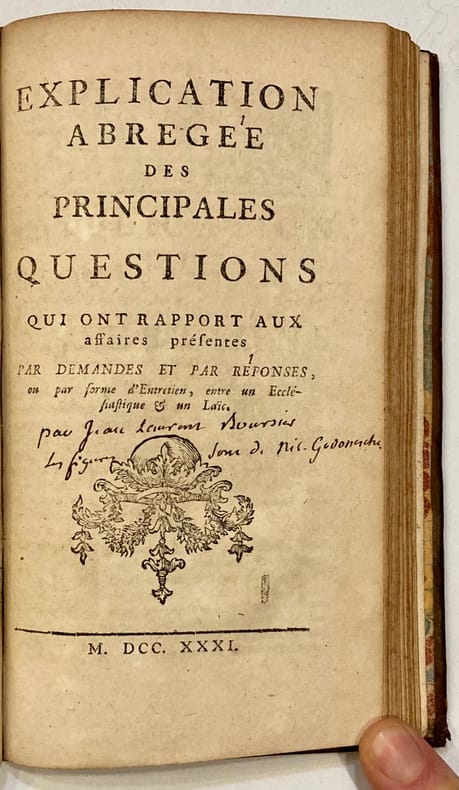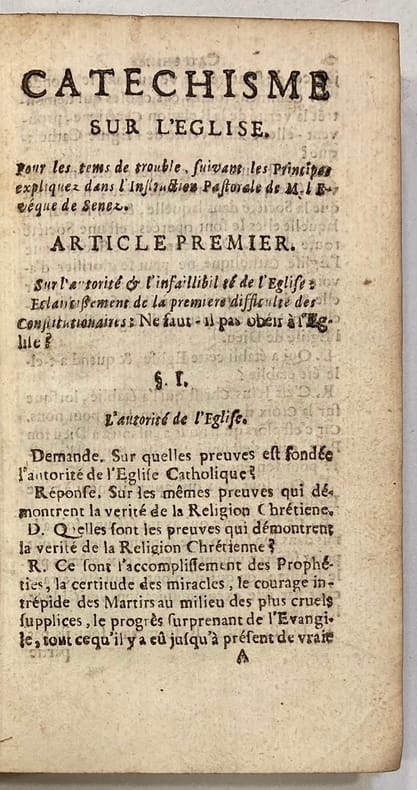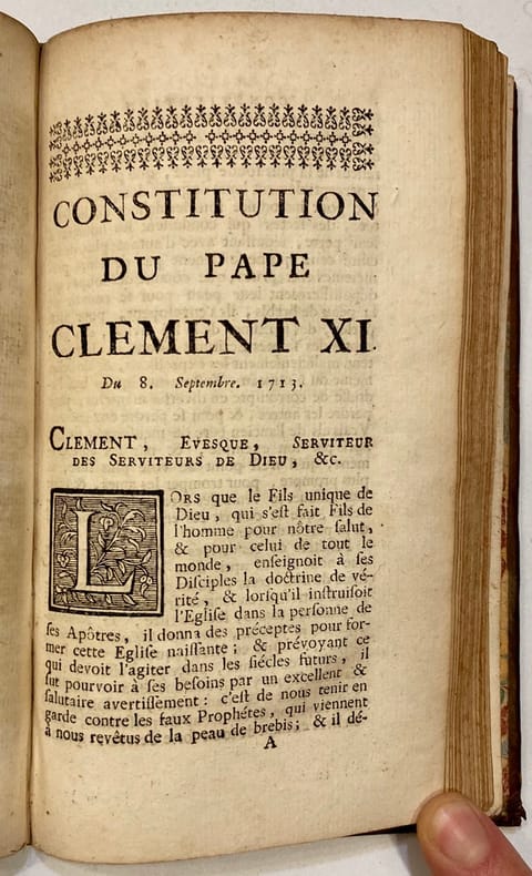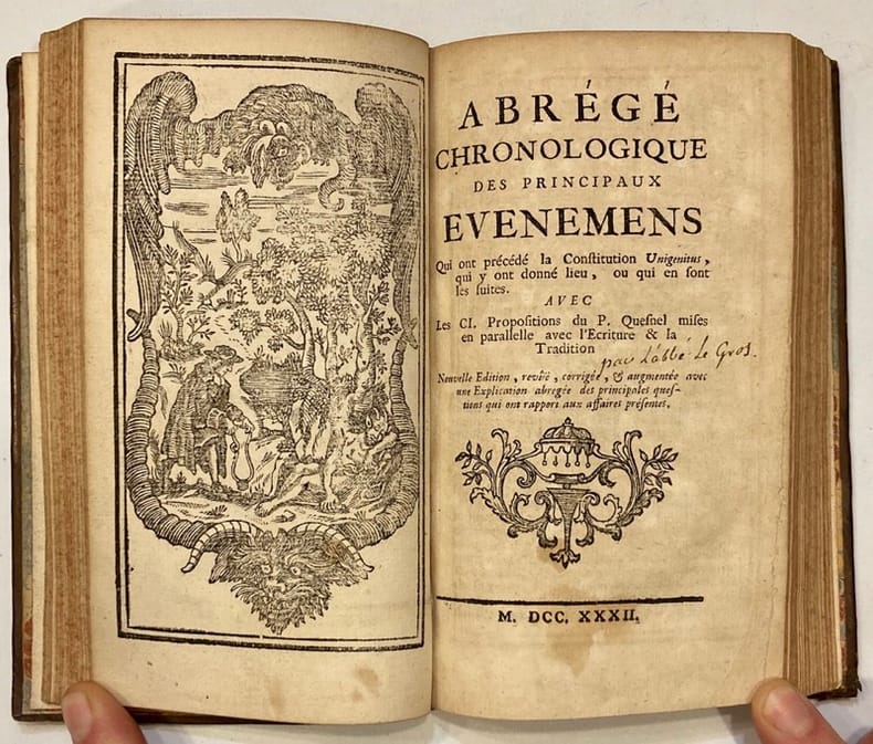 Edition originale. Petits trous de vers en marge de quelques feuillets. Barbier I, 534. Reliés à la suite : - (LE GROS). Abrégé chronologique des principaux événements qui ont précédé la Constitution Unigenitus... 1732. (2) ff. ; 74 pp. ; (1) f. Illustré d'un frontispice. - Constitution du Pape Clément XI. 41 pp. ; (3) pp. - (BOURSIER). Explication abrégée des principales questions qui ont rapport aux affaires présentes... 1731. 82 pp. Illustré de 12 gravures hors-texte de Gogenesche.