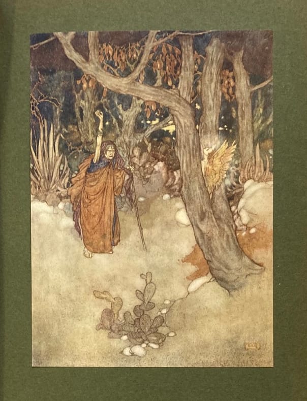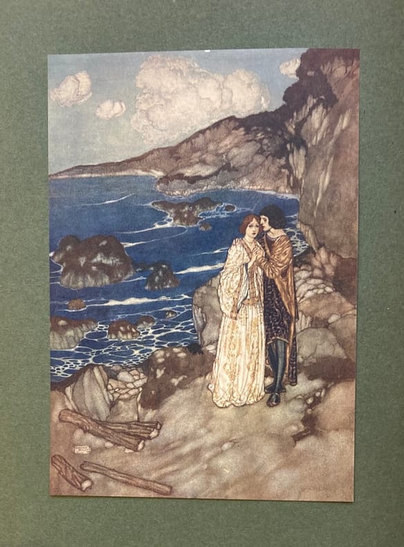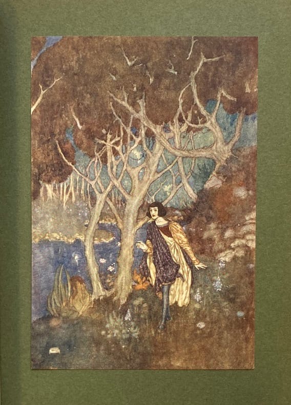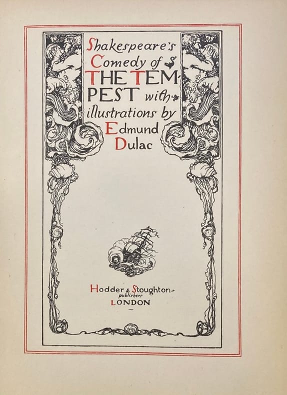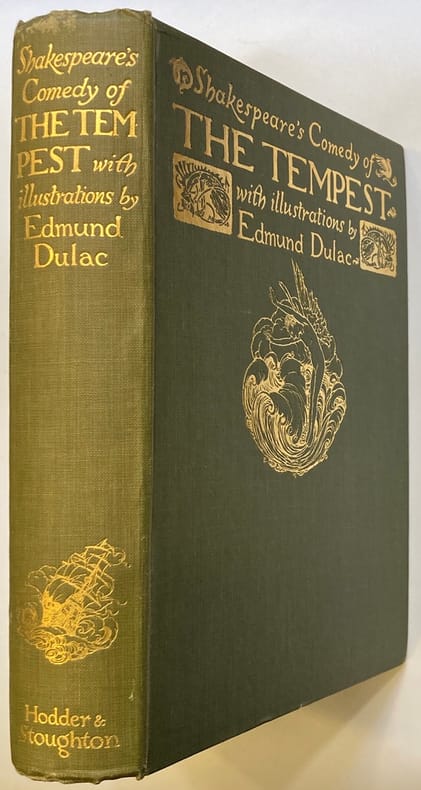 Robert ANNING-BELL (1863-1933) est un des derniers représentants du préraphaélisme, où le corpus shapespearien est très prisé ; membre des Arts and Craft, il pratique la mosaïque, la peinture, le vitrail et l'illustration. L'illustration de La Tempête (publiée en 1611), lettrines, bandeaux, pleine-page, foisonne d'inventivité. Les N° de l'acte et de la scène sont inscrtis en rouge en haut de chaque page. Coins émoussés, petites brunissures et déchirures.