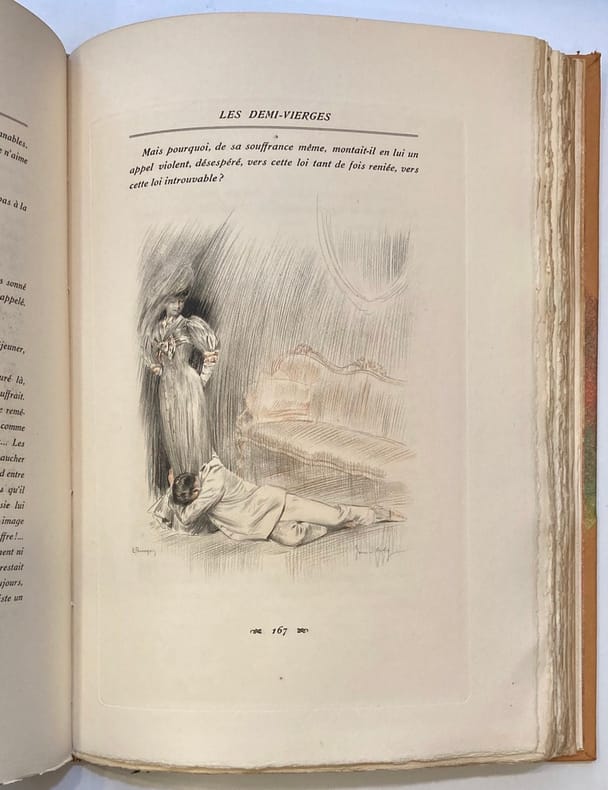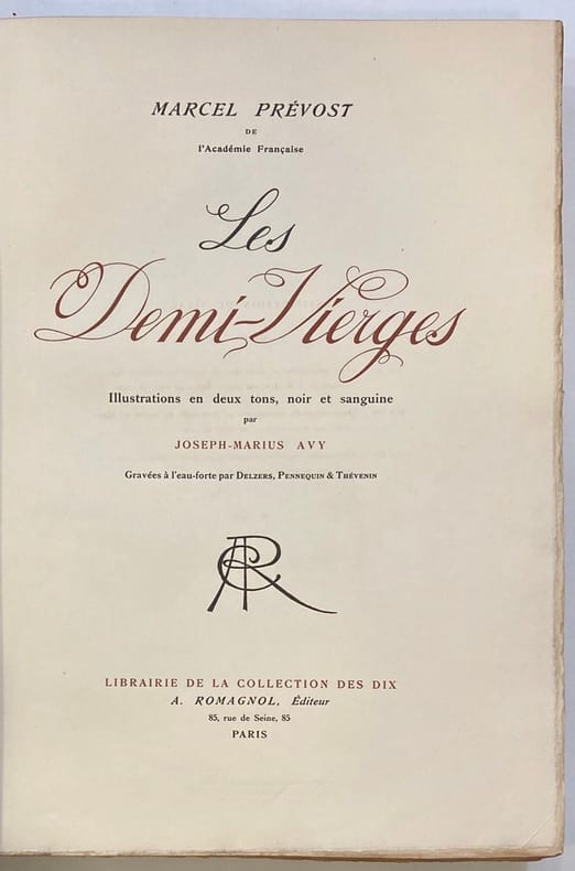 Edition définitive avec 16 illustrations originales de Gaston Fédit, gravées par Paul Baudier Complet en un volume relié demi cuir à coins, 21x16, couvertures d'origines conservées avec dos, avec son emboitage, 270 pages, état neuf. Paris Librairie Hachette, 1930 Résumé; " A lire Les Demi-Vierges, on croirait que l'avenir et la stabilité de la société tiennent à la vertu de ses filles. Toutes ? Non, les seules jeunes personnes du monde oisif et élégant. Prévost n'en connaît pas d'autre. L'oisiveté lui semble être un élément essentiel de la qualité humaine et de l'emploi du temps des gens bien. L'oisiveté, c'est le cinq à sept, la possibilité pour les dames d'avoir leur " jour ", pour les messieurs de s'y rendre, et, pour les (presque) jeunes filles de passer un discret moment chez une amie complaisante qui leur laisse la libre disposition d'une chambre. Une chambre ! Ah, qu'y font-elles ? C'est la seule question que pose M. Prévost pendant quatre cents pages. Jusqu'où vont-elles ? Qu'acceptent-elles ? Il faut le reconnaître, il y a de quoi bouleverser les jeunes viveurs d'il y a un siècle. Qu'on imagine la poupée interdite qu'était alors une jeune fille, serrée dans un corset, enveloppée de jupons, une modestie voilant son décolleté, l'usage dégageant ses épaules - le soir, l'été - et laissant s'échauffer les rêves au-dessus de la gorge, de ce sillon, de cette félicité, de cette attente, de cette offrande. Oui, jusqu'où vont-elles ? La société de 1900 - à mi-chemin entre la Fête impériale et les audaces à la Paul Morand - avait élevé la traque des pucelages par les hommes et leur défense farouche par les filles à la dignité de ballet impudique, de parade ritualisée et acharnée. Là aussi, comme dans un duel, on s'arrêtait au premier sang ". François Nourissier de l'Académie Goncourt. ref/267