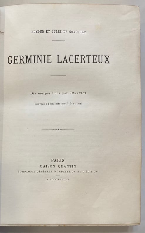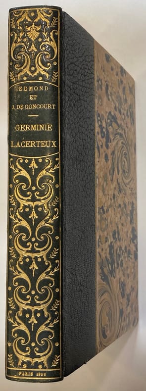 1 volume grand in-8 (22,5 x 15,5 cm), demi maroquin brun (reliure de l’époque), couverture conservée, dos à nerfs joliment orné, double filet doré en bordure, tranche de tête dorée, xix-[1]-294-[2] pages (complet). Très bon état. Nouvelle édition, menée par Edmond seul, illustrée de dix compositions par Jeanniot, gravées à l’eau-forte par L. Muller. Edmond (1822-1896) et Jules (1830-1870) de Goncourt sont des écrivains et historiens français, véritables précurseurs du courant naturaliste, plus tard théorisé et popularisé par Emile Zola. Ils publient ce roman, rédigé à quatre mains, pour la première fois en 1865, inspiré par leur propre domestique, Madame Rose Malingre - ici présente sous les traits de Germinie Lacerteux. Ce n’est qu’au décès de cette servante qu’ils apprennent la double vie qu’elle a menée des années durant, endettée et ruinée par amour. Bel exemplaire.