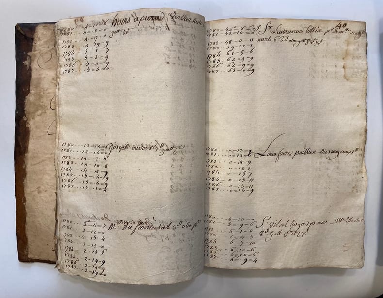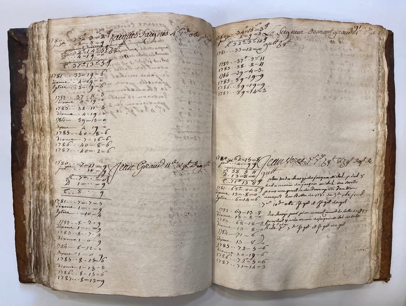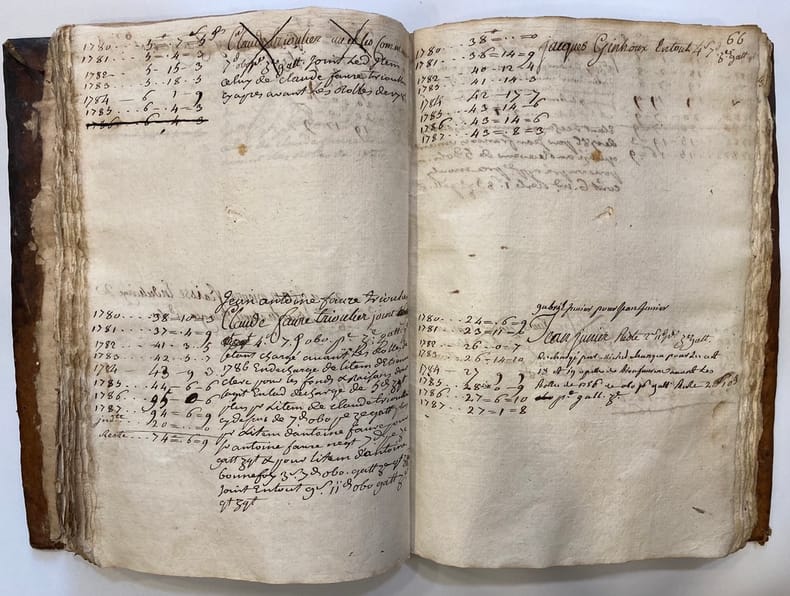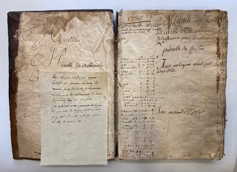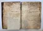 Cahier manuscrit de la tenue des comptes concernant le mandement de la taille pour la région d’Yssingeaux.Ce cahier composé de 129 feuillets écrits à l’encre noir, pour la plupart recto-verso, répertorie par chef lieu les versements de la taille effectués entre 1780 et 1787 par :L’hôpital d’Yssingeaux (p.35, 43, 47, 53 et 122), le curé d’Araules, les sœurs de St Joseph, le seigneur de St Bonnet, différentes parcelles (la Besse, Allinhac, Arssac, la Pervenchère…) et de nombreux contribuables.Témoignage manuscrit sur ce canton de Haute-Loire pendant la période pré-révolutionnaire, avec ses répartitions territoriales, ses habitants et ses institutions.Reliure abimée, mors fendus, épidermures. Petite galerie de vers à l’intérieur, mouillures.