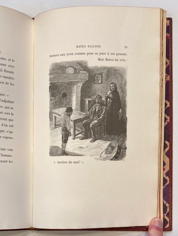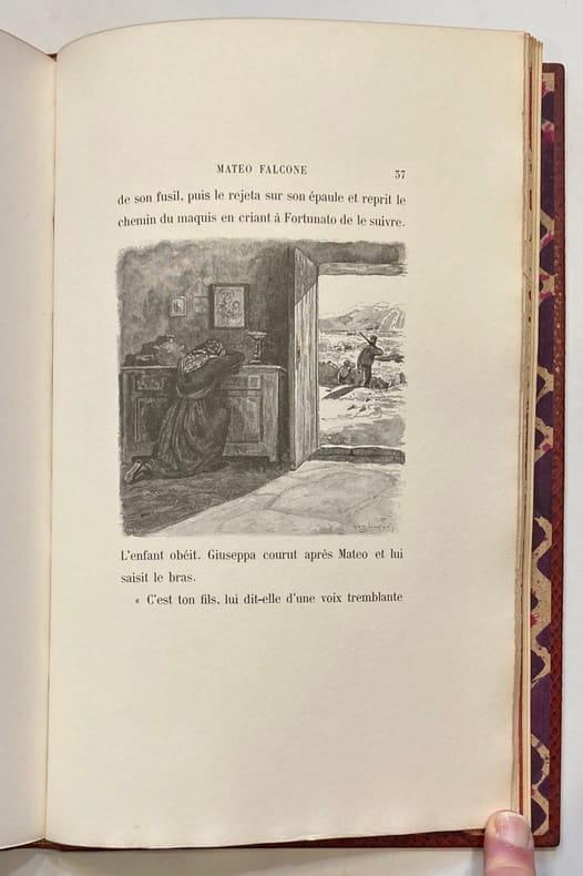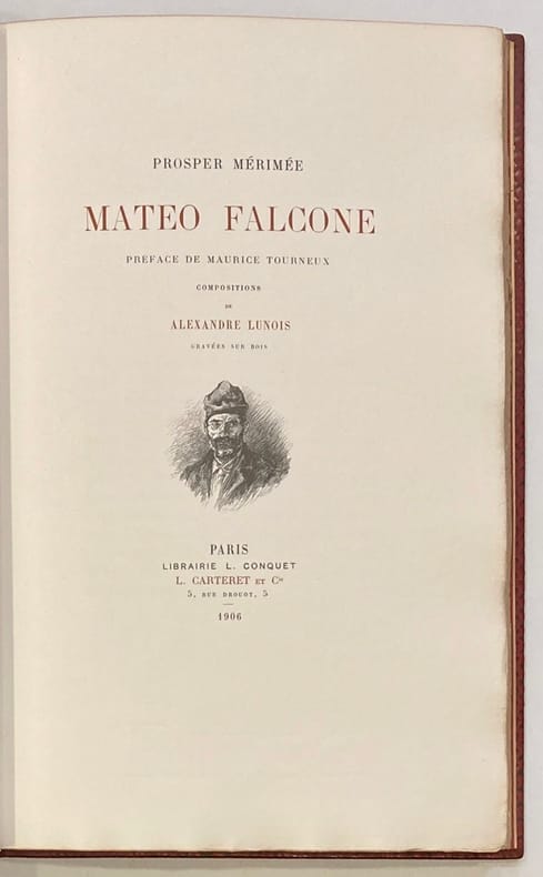 Illustré de bois d'Alexandre Lunois. Préface de Maurice Tourneux. 1 des 250 exemplaires numérotés sur vélin blanc.Nouvelle tragique, un chef-d'œuvre de Mérimée, qui met en scène un propriétaire corse et son fils coupable de trahison.