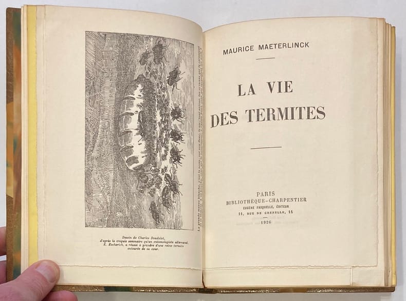 La vie des termites in 8 broché,couverture rempliée,faux-titre,titre,197 pages,1 feuillet de table édition numérotée sur grand vergé Aux éditions du livre Monte-Carlo Très bon état La vie des fourmis in 8 broché,couverture rempliée,faux-titre,titre,237 pages,1 feuillet de table,édition numérotée sur grand vergé.Aux éditions du livre Monte-Carlo Très bon état La vie des abeilles in 8 broché, couverture rempliée,faux-titre,titre,296 pages,1 feuillet de table,édition numérotée sur grand vergé.Aux éditions du livre Monte-Carlo vers 1945 Très bon état Ces 3 volumes sous chemise éditeur cartonnée avec titres et emboitage bordé de toile rouge.Très bon état.
