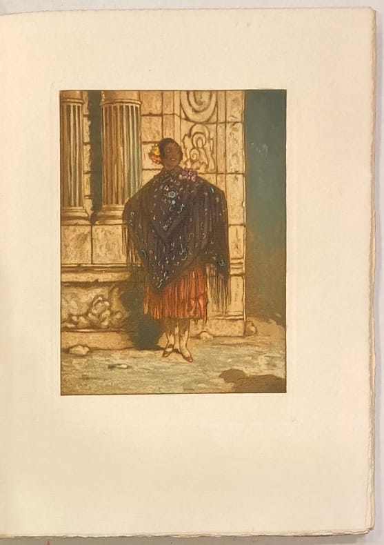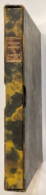 La Bibliothèque Française, 1949. Editeurs Français Réunis. 1954. Un volume in-folio en feuilles sous couverture carton recouverte de papier vélin d 'Arches remplié, titre imprimé sur le front. Emboîtage en carton recouvert de toile de jute, titre imprimé en rouge sur le dos. - 3 AQUATINTES datées sur le cuivre 30.4.49,I,II ou III. (40,7 x 30,5cm). - 1 POINTE-SÈCHE datée sur le cuivre 24.10.60 (20x14,8cm). - 1 LITHOGRAPHIE EN COULEURS « Toreros y Senorita » sur papier report, datée 24.10.60 et 4.11.60 (34,2x23cm). Les 5 épreuves sont numérotées 185/245 et présentées dans un feuillet vélin d'Arches plié en deux inséré dans l'ouvrage. Edition à 275 exemplaires : l'un des 245 exemplaires sur vélin d'Arches, numérotés de 1 à 245, le nôtre porte le N°185, SIGNÉ PAR PICASSO ET ARAGON. Exemplaire en parfait état. (Cramer 126, Bloch 1000 à 1005). Photographies supplémentaires sur demande. - ENGLISH : Pablo PICASSO - Prosper MERIMEE – Louis ARAGON. LE CARMEN DES CARMEN. With three aquatints, one drypoint and one lithograph in color by Pablo Picasso, each numbered 185/245 in pencil. La Bibliothèque Française, 1949. Editeurs Français Réunis. 1954. Portfolio with three aquatints (40,7 x 30,5cm), one dry-point (20x14,8cm), and one lithograph in colors (34,2x23cm), by Pablo Picasso, loose as issued, title, justification page, and text with numerous illustrations in color (printed in lithograph) and border decorations also by Picasso. THE BOOK IS SIGNED BY PICASSO AND ARAGON on the justification page. One of 245 copies on Arches wove paper (n°185), perfectly preserved in the original publisher box (reference : Bloch. 1000-1005 ; Cramer books 126).