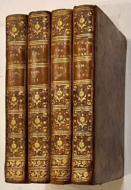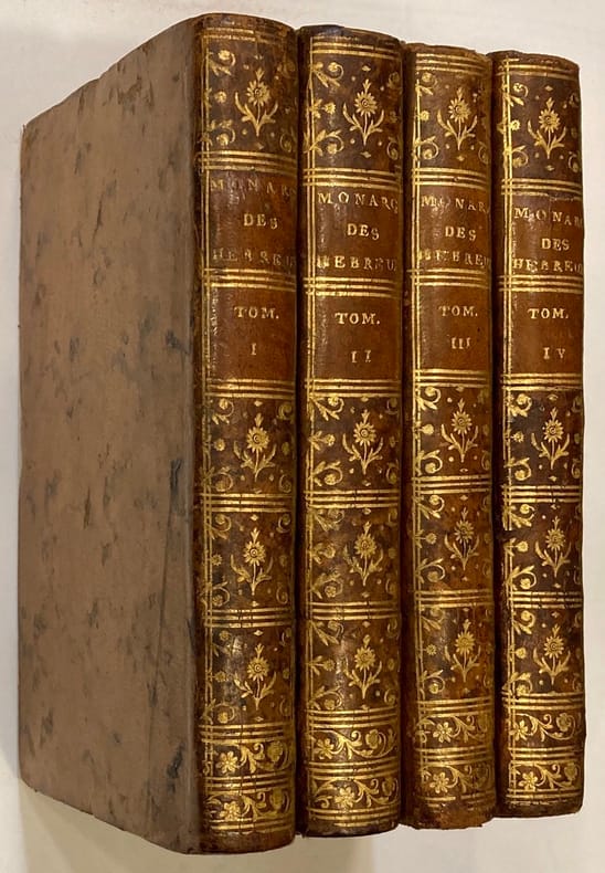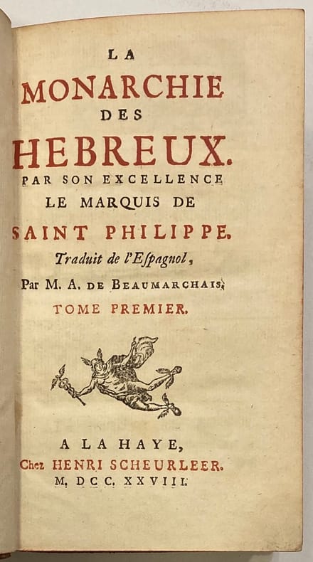 Traduit de l’espagnol par A. De Beaumarchais.Historien originaire de Sardaigne, Vincent Baccalar, Marquis de Saint-Philippe, livre une histoire complète du gouvernement des juges bibliques d’Israël durant 360 ans, du règne d’Othoniel à celui d’Osée. Cette formidable épopée « mémorable par une foule d’heureux succès, de disgrâces, de violence, de divisions intestines… » met en scène une succession de monarques « dont l’autorité est uniquement fondée sur leur intégrité, sur leur valeur, sur leur droiture, leurs grands exploits ». Reliures légèrement frottées, avec manques aux coiffes supérieures. Certains feuillets jaunis.
