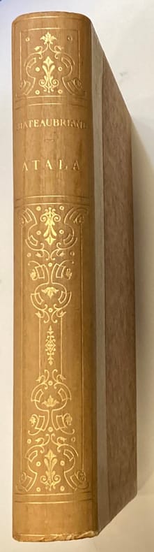 L'édition originale d'Atala, rare, parut en 1801 et René fut publié l'année suivante dans le Génie du christianisme. L'édition de 1805 réunit pour la première fois ces deux récits dans un volume illustré et comporte quarante-six pages de préface en édition originale, dans lesquelles Chateaubriand revient sur la genèse des textes, répond aux critiques et précise le cadre dans lequel ils doivent être lus. Chateaubriand avait commencé sa carrière littéraire en rapportant de son voyage en Amérique l'expérience des paysages et des peuples du Nouveau Monde. Parti de France en 1791, il affirma avoir parcouru les rives de l'Hudson jusqu'à Albany et les environs des chutes du Niagara, quête romantique du « bon sauvage » et de la solitude des forêts nord-américaines qui nourrit l'imaginaire d'Atala. Dès sa publication, le récit connut un succès immense et reste indissociable du célèbre tableau peint en 1808 par Anne-Louis Girodet, aujourd'hui conservé au Louvre, représentant la jeune héroïne morte, portée par Chactas et le père Aubry vers sa sépulture : une interprétation qui témoigne de l'immense retentissement du récit dans la culture du début du XIXᵉ siècle. Bon exemplaire en reliure d'époque, sur vélin. il est enrichi, pour Atala, de deux gravures supplémentaires, gravées par Amboise Tardieu, légendées en espagnol pour une édition que nous n'avons pu identifier.