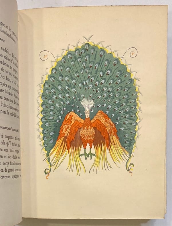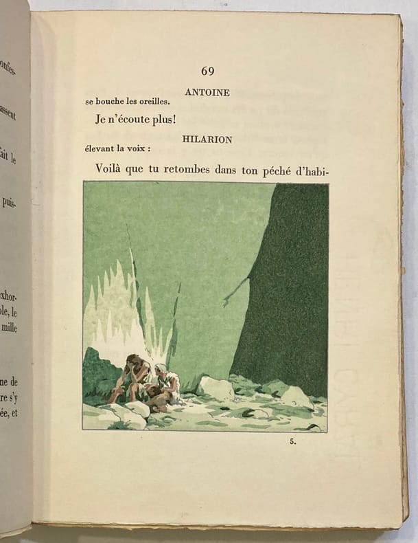 Texte original de Paul Valéry, "La tentation de Flaubert" en guise d'introduction 10 illustrations pleine page et en couleurs par Daragnès ainsi que les têtes de chapitres et culs de lampes en bicolore n°847 sur 1480 Exemplaire en parfait état dans une reliure superbe , signée Alloiteau en maroquin vert : travail excetionel :dos a gros nerfs 2 fois 5 nerfs enormes photos sur demande coffret en plus de la reliure
