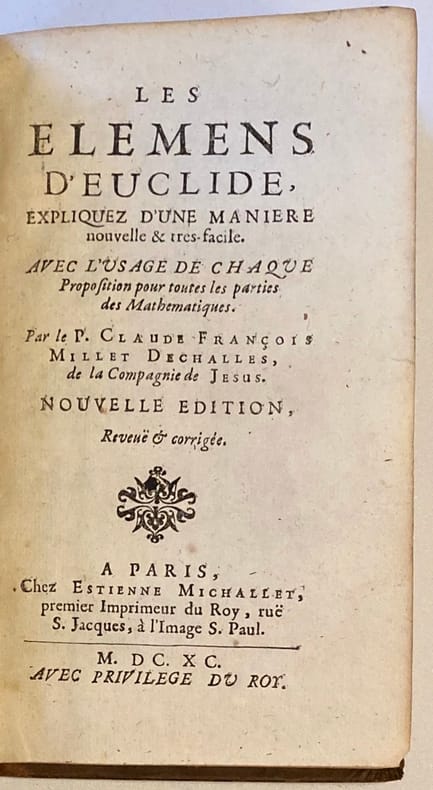 Nouvelle édition revue, corrigée.Eclaircissements de ce célèbre traité mathématique et géométrique d’Euclide par le père jésuite Dechalles paru pour la première fois en 1672 et illustré de nombreuses figures. Notes manuscrites sur les gardes : Appartient à Muzac - 1693. Petit manque angulaire p. 387-388. Reliure légèrement frottée, coiffe supérieure abimée.