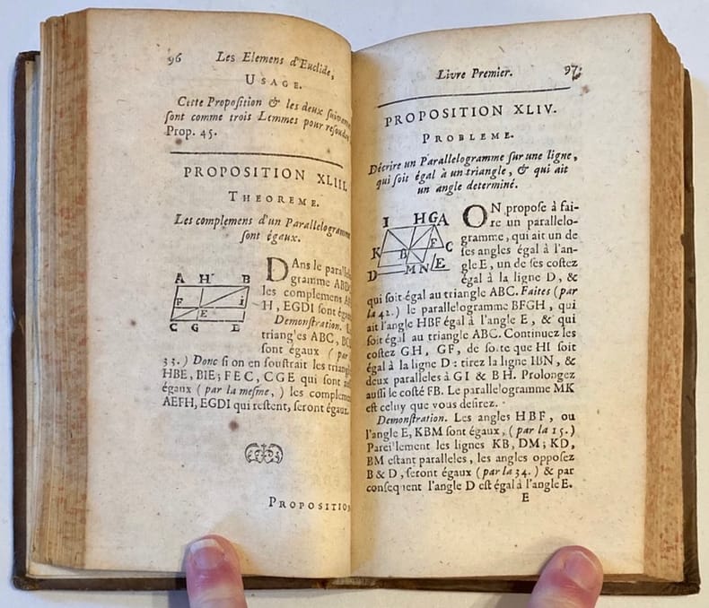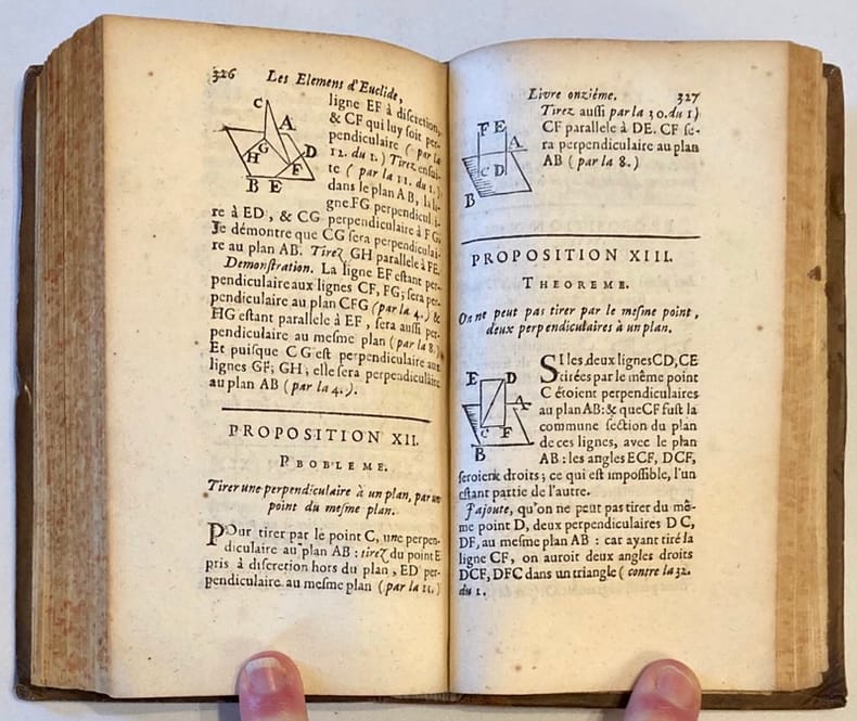 Nouvelle édition revue, corrigée et augmentée par M. Ozanam, de l’Académie des sciences.Eclaircissements de ce célèbre traité mathématique et géométrique d’Euclide par le père jésuite Dechalles paru pour la première fois en 1672 et illustré de 16 planches dépliantes. Notes manuscrites (XIXème) à l’encre: sur les gardes (vie et oeuvres d’Euclide) et sur la doublure inférieure (Fruits de l’étude des mathématiques).Mors et charnière fendus, manque coiffe inférieure, 2 coins émoussés, discrètes restaurations. Quelques rousseurs.