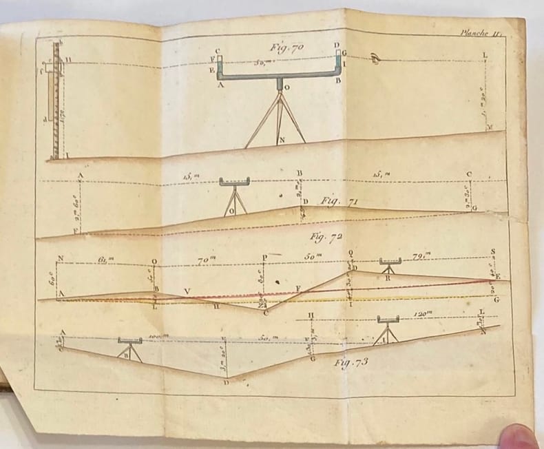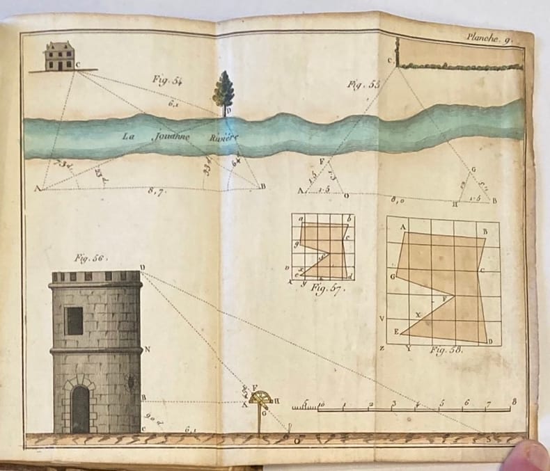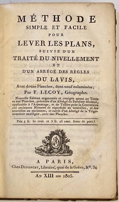 Illustré de 14 planches dépliantes, dont 10 ont été aquarellées à l'époque. Cinquième édition, c'est la première contenant la description du calculateur graphite de Gelinsky, illustrée par une planche. Il permet de calculer des surfaces sur un plan par la méthode graphique, en transformant une figure irrégulière en une forme plus simple, telle qu'un triangle. Cet instrumenta été fabriqué par Richer et on peut l'acheter au prix de 100 francs. La première et dernière planche sont légèrement rognées sur la marge extérieure. /// In-12 de XXIV, 132 pp., 14 planches. Demi-basane rouge. (Reliure de l'époque.) //// /// PLUS DE PHOTOS SUR WWW.LATUDE.NET