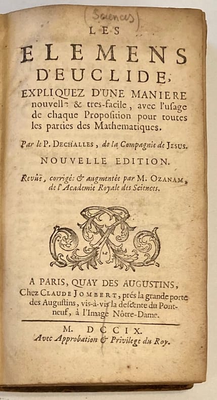 Nouvelle édition revue, corrigée.Eclaircissements de ce célèbre traité mathématique et géométrique d’Euclide par le père jésuite Dechalles paru pour la première fois en 1672 et illustré de nombreuses figures. Notes manuscrites sur les gardes : Appartient à Muzac - 1693. Petit manque angulaire p. 387-388. Reliure légèrement frottée, coiffe supérieure abimée.