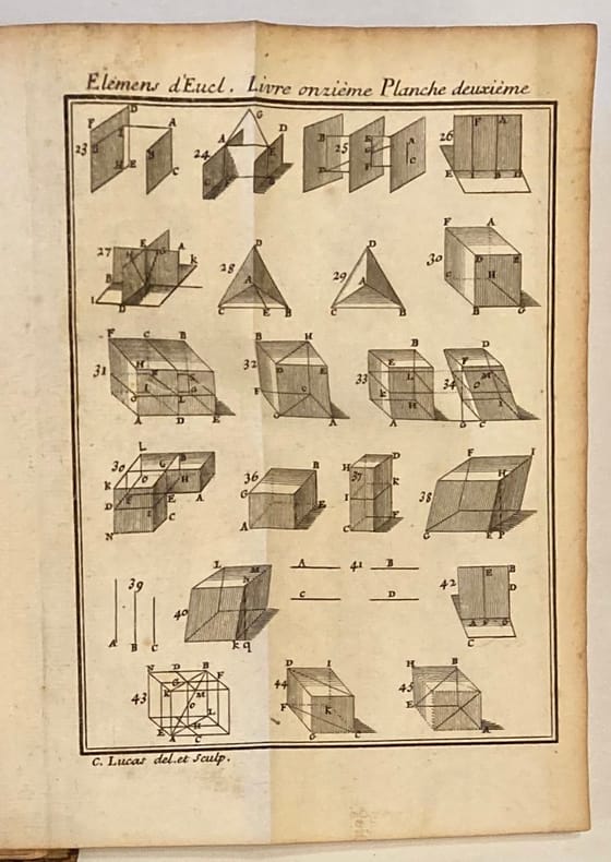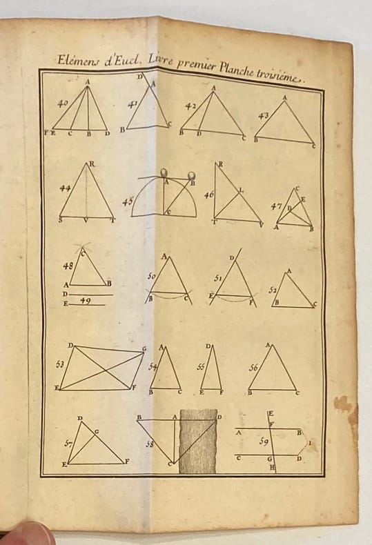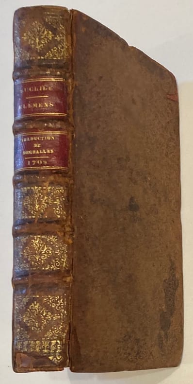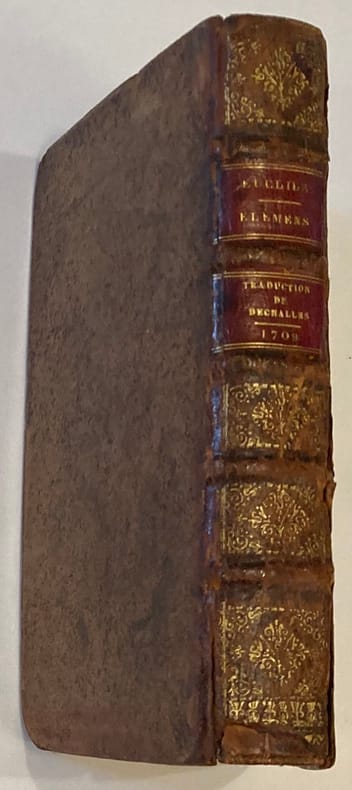 Nouvelle édition revue, corrigée et augmentée par M. Ozanam, de l’Académie des sciences.Eclaircissements de ce célèbre traité mathématique et géométrique d’Euclide par le père jésuite Dechalles paru pour la première fois en 1672 et illustré de 16 planches dépliantes. Notes manuscrites (XIXème) à l’encre: sur les gardes (vie et oeuvres d’Euclide) et sur la doublure inférieure (Fruits de l’étude des mathématiques).Mors et charnière fendus, manque coiffe inférieure, 2 coins émoussés, discrètes restaurations. Quelques rousseurs.