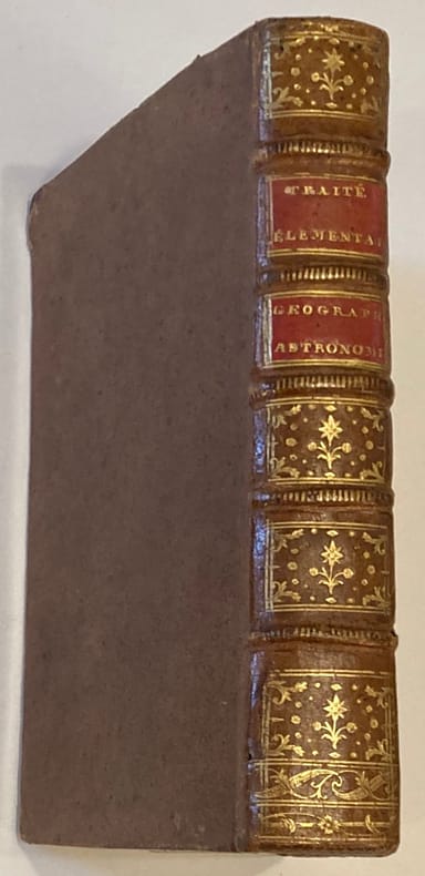 Edition originale de ce traité divisé en 3 livres (la terre comme globe céleste, comme matière, puis comme habitée), illustrée de 3 grands tableaux sur les latitudes et longitudes de la France, de l’Espagne et du Portugal,et sur les provinces espagnoles.Petit trou de vers sur le premier plat. Petites déchirures: sans manque p.86., marginale p.184. Déchirure en coin avec petit manque p. 341. Quelques rousseurs. Petit trou p.458.Barbier IV, 798.