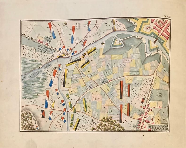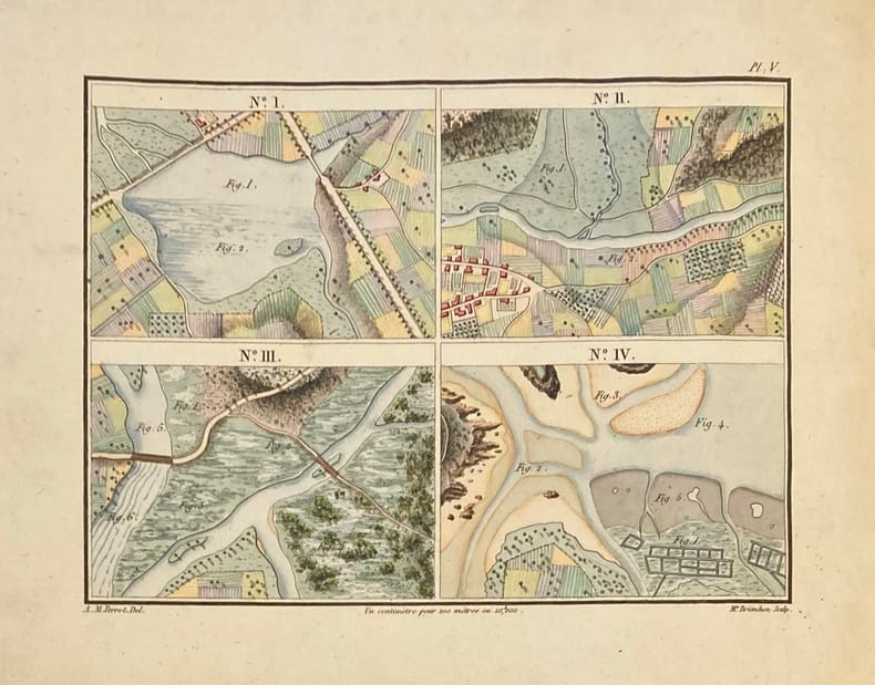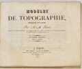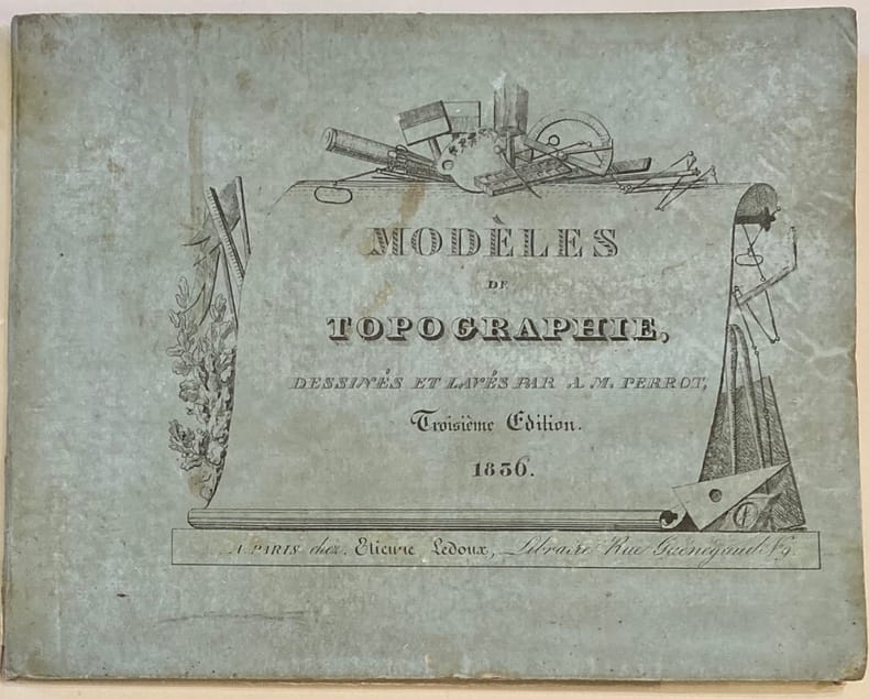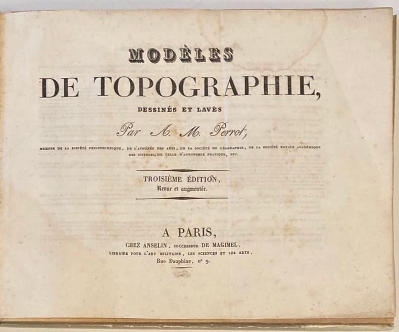 3ème édition revue et augmentée de ce recueil de 13 planches topographiques dont 8 en couleurs, accompagnées de leur explication en regard, et d’1 tableau comparatif des échelles.« Un dessin topographique est un véritable paysage… Nous en avons dessiné et lavé nous-mêmes les détails avec le plus grand soin. Nous avons ainsi évité la raideur que l’on reproche, avec quelque raison, à la gravure dans ces sortes d’ouvrages, et donné à nos modèles tout le moelleux et le mérite de dessins entièrement faits à la main. »Les modèles représentent montagnes, terres de différentes natures, pièces d’eau, forêts et cartes militaires.Date gratée sur la page de titre. Couverture roussies. Mouillure et quelques rousseurs.