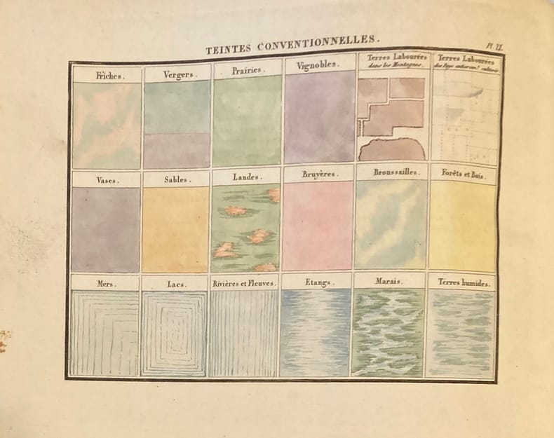 Etude de topographie. Tableau des teintes conventionnelles adoptées en France pour les minutes topographiques. Signes conventionnels adoptés en France. Classification Dewey : 551-Géologie