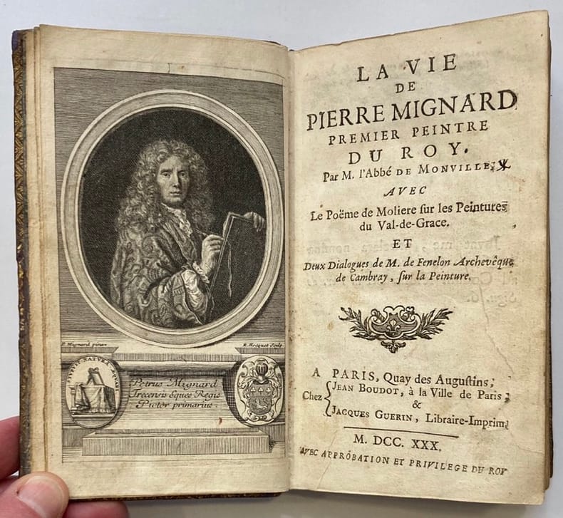 Edition originale illustrée d’un portrait-frontispice de Mignard, contenant également "le poème de Molière sur les peintures du Val-de-Grâce et Deux dialogues de M. De Fénelon Archevêque de Cambray, sur la peinture". Pierre Mignard, élève de Simon Vouet, a peint le dôme du Val de Grâce, ou encore le petit appartement du Roi à Versailles aujourd’hui disparu… Sa peinture reste très influencée par ses vingt années passées en Italie.Carton ajouté p.89-91. Annotation manuscrite récente p.179. Annotations biffées manuscritse sur les gardes.Mouillures p. XLVI à LXXII et 81 à 89. Quelques rousseurs (petit trou p.159). Petit défaut de papier p. 187 (page notée en double). Reliure légèrement frottée, traces de petites restaurations.Quérard V, 666. Tchemerzine V, 232.