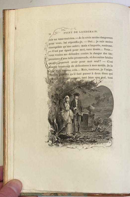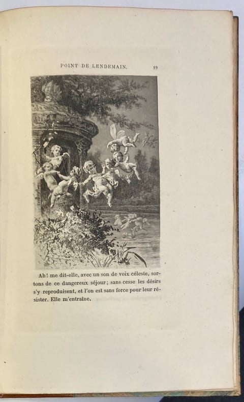 Court roman libertin de Vivant Denon (1747-1825), “Point de lendemain” raconte les premières aventures amoureuses d'un jeune homme ignorant tout des subtilités du monde aristocratique. “Les Amants”, film de Louis Malle, sur un scénario de Louis Malle et Louise de Vilmorin, avec Jeanne Moreau, Jean-Marc Bory et Alain Cuny, est inspiré, d'assez loin, de “Point de lendemain”. Bon état d’occasion