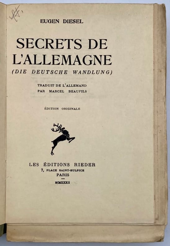 Edition originale française.1 des 5 exemplaires hors-commerce sur Japon Impérial, 1er papier. Traduit de l'allemand par Marcel Beaufils. "L'ouvrage comporte deux développements d'essence très différente. Dans le premier, j'ai essayé de me rendre compte exactement de l'apparence du pays, de la nature de l'homme, de réagir devant le fait allemand... La seconde partie, en revanche, est née de la nécessité où je me suis trouvé de définir moi-même l'époque, sans doute digne d'attention, mais périlleuse et surtout difficilement définissable...".