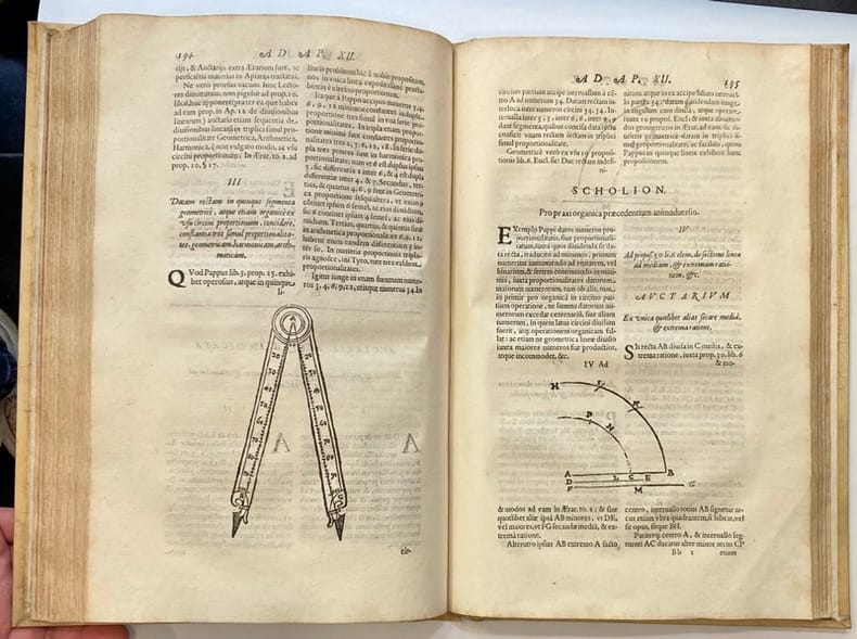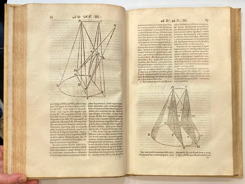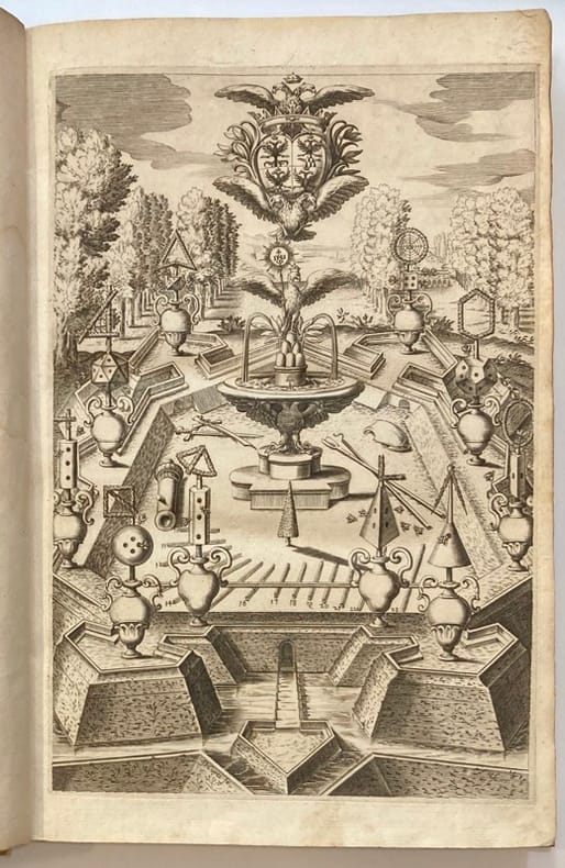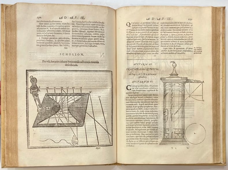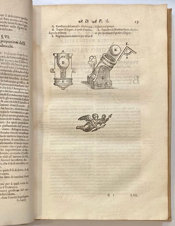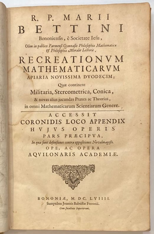 Relié à la suite : Appendix Tomi Tertii Apiariorum philosophiae mathematicae... Venise. Paolo Baleoni. 1655. (2) ff. ; 82 pp. ; (1) f.Première édition publiée sous ce titre du 3ème et dernier tome de l’Aparia Universae philosophiae paru chez Ferroni en 1642. Cet important ouvrage encyclopédique sur les sciences est illustré d’1 frontispice gravé sur cuivre, d’1 petit portrait de l’auteur gravé en début d’ouvrage, et de nombreuses gravures sur bois in-texte. Il traite de perspective, d’astronomie, de géométrie, d’optique, et d’inventions scientifiques comme le pantographe...Chacun des 8 chapitres de la première partie possède sa propre page de titre.Ex-libris moderne. Petite pièce de papier contrecollée p.14 masquant un commentaire imprimé en marge. Feuillets dépliants p. 72, 73, 77, 79 (part.II)Mouillure en marge intérieure en début d’ouvrage. Déchirure sans manque p.13 (part.II). Brunet I, 833.