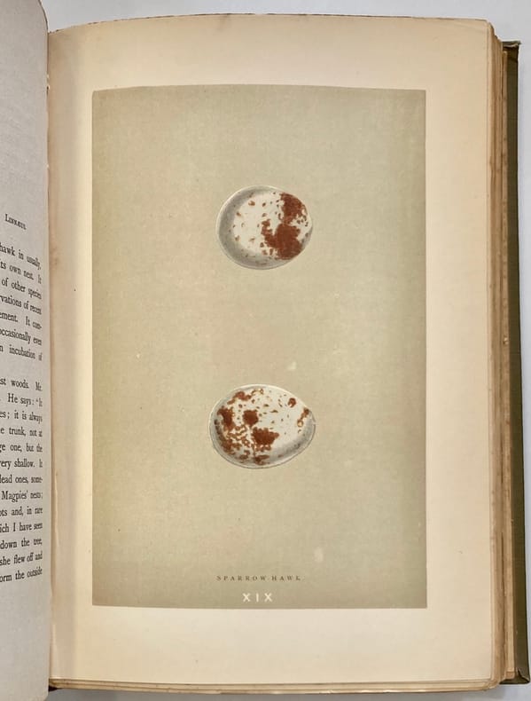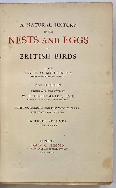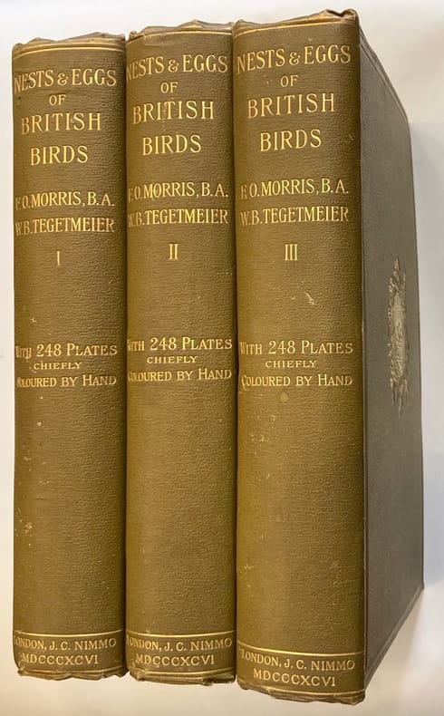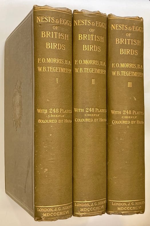 Quatrième édition de cet ouvrage de référence sur les nids et oeufs des oiseaux anglais. Illustré de 248 planches hors-texte en couleurs représentant des oeufs et des nids. L'entomologiste et ornithologue irlandais Francis Orpen Morris (1810-1893) a décrit les oeufs et des nids de centaines d'oiseaux, y compris de certaines espèces aujourd'hui éteintes comme le Grand Pingouin ou la tourte voyageuse. Bon exemplaire dans sa reliure éditeur ornée d'un nid doré. Légers frottements, petites rousseurs éparses.- Ex-libris armorié de William Rhodes Emmott.