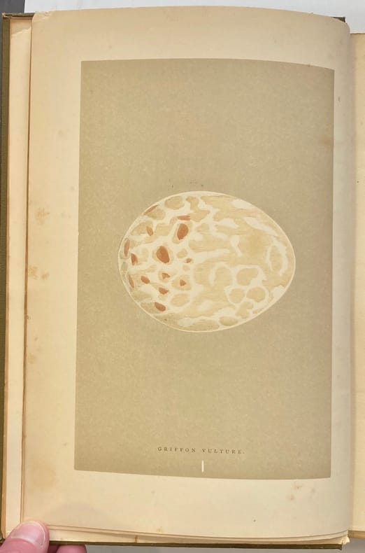 Illustré de 232 planches lithographiées en couleurs hors texte, chaque planche est protégée d'un feuillet de papier mince. Piqûres, accroc à la coiffe supérieure du 1er volume, dos décolé à ce même volume. Bon exemplaire de ce célèbre et spectaculaire recensement des nids et oeufs des oiseaux des iles britaniques. (Reu-Co1)