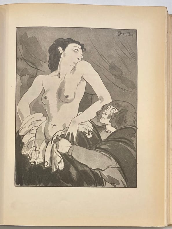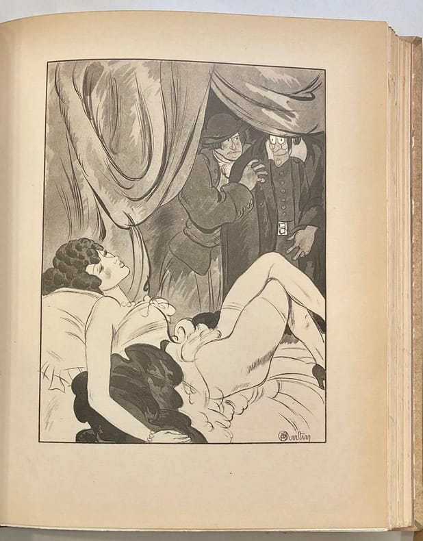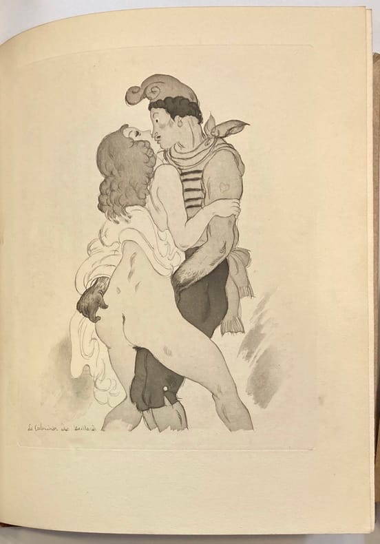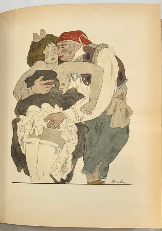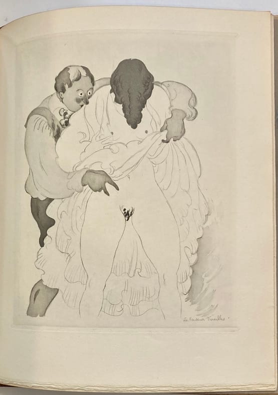 Inutile de revenir sur le texte des Contes et Nouvelles en vers de La Fontaine, paru pour la première fois entre 1665 et 1671 (sans illustrations) et pour la première fois illustré en 1685. Aquarelle originale monogrammée Aquarelle originale signée (définitive) ayant servi au clichage De nombreux artistes ont illustré ces Contes et Nouvelles en vers, toujours lestes ou grivois, avec ou sans l'inspiration délibérément érotique que chacun a pu y mettre depuis la première édition illustrée de 1685. Aquarelle originale monogrammée Les Contes et Nouvelles en vers de La Fontaine, inspirés de plusieurs œuvres françaises et italiennes des XVe et XVIe siècles, dont le Décaméron de Giovanni Boccace, Orlando furioso de Ludovico Ariosto, le recueil anonyme des Cent Nouvelles Nouvelles et l'œuvre de Bonaventure Des Périers, sont mille fois plus réjouissant à lire que les célèbres Fables dont on a rebattu les oreilles de tout élève en devenir d'être un homme. Les Contes et Nouvelles avaient sans l'ombre d'un doute mille fois plus de raisons pour forger un homme près à affronter son destin croisant celui des dames. Chacun cherche son chat ... Aquarelle originale monogrammée Cette édition est à tort négligée des bibliophiles du fait d'un tirage trop important. Il faut rechercher comme ici les exemplaires de luxe. Aquarelle originale monogrammée Les aquarelles originales de Charles Martin sont très prisées des amateurs. Il fut un des grands illustrateurs de la période Art Déco. Charles Martin est né à Montpellier en 1884 et mort à Paris en 1934 à l'âge de 50 ans seulement. Sa production est très importante. Il a contribué à l'illustration de nombreuses revues d'art et de mode depuis 1912 (Gazette du Bon Ton, Femina, etc). La guerre où il sert comme simple soldat d'infanterie stoppe nette sa carrière mais il continue malgré tout à dessiner et à envoyer ses travaux à la presse, tant qu'il peut. Lors d’une permission, il montre son travail à Lucien Vogel, le créateur de la révolutionnaire Gazette du Bon Ton. Enthousiaste, l’éditeur lui propose d’en tirer un album. Sous les Pots de Fleurs (le terme désigne le casque Adrian qui équipe l’armée française) paraît le 1er décembre 1917. Comme un Laboureur ou un Chas Laborde, Martin refuse de se soumettre à la « culture de guerre ». On ne trouve chez lui aucune des outrances et conventions du dessin naturaliste et de son pseudo réalisme. Il revient de la guerre. Le style de Charles Martin, au trait délicat, excelle dans les techniques de l'eau-forte et du pochoir rehaussé d'un trait typographique. Influencé par le cubisme, son style devient épuré et se caractérise par un trait précis, efficace et joyeux. Il s'oriente rapidement vers le luxe et l'art décoratif. Il exerce son talent dans les domaines les plus variés : mode, flacons de parfumerie, meubles, papiers peints, affiches, etc. Charles Martin a illustré une vingtaine de livres dont les Contes et Nouvelles de La Fontaine que nous présentons ici. Nous soupçonnons par ailleurs Charles Martin d'avoir illustré un clandestin totalement érotique en 1926 dont le trait est vraiment typique de l'artiste (mais ...). Aquarelle originale monogrammée Exceptionnel exemplaire contenant 8 aquarelles originales abouties et 1 esquisse pour une composition libre, une suite libre de 15 eaux-fortes en noir et une suite complète des 64 compositions hors-texte (soit 143 estampes au total). Très bon exemplaire tel que paru.