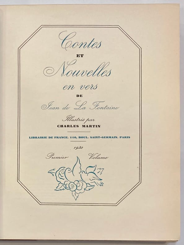 Librairie de France, 110, Boulevard Saint-Germain, Paris, 1930 2 volumes grands in-4 (28,5 x 13 cm) brochés de (6)-XXI-249-(6) et (6)-361-(1) et (17) pages d'introduction signée André Fontainas. Avec 64 illustrations hors-texte de Charles Martin dont 32 rehaussées en couleurs au pochoir à l'aquarelle, les 32 autres étant en noir. Les aquarelles originales de l'artiste ont été reproduites par la photogravure (non interprétées donc). Couvertures imprimées en brun et bleu à rabats. Le texte est imprimé en noir avec encadrements, ornements et décors imprimés en bleu ciel. Exemplaire encore protégé par son papier cristal d'origine et dans son emboîtage spécial en papier bleu titré imprimé. Partiellement non coupé (presque entièrement). Petites amorces de fente du papier au dos du premier volume, sans aucune gravité. Beau papier d'Arches fort resté bien blanc sans rousseurs. Le tirage a été de 3.000 exemplaires. Celui-ci est un des 350 exemplaires sur papier d'Arches. Il a été tiré 15 ex. sur Japon, 50 ex. sur Hollande, 350 ex. sur Arches, 1500 ex. sur vélin pur fil Lafuma et 1500 ex. sur vélin d'alfa Navarre. Notre exemplaire porte le numéro CCCXVII. Notre exemplaire contient livré à part la suite des 15 eaux-fortes libres tirées à très petit nombre. Elles sont tirées en noir sur papier d'Arches également. Notre exemplaire contient livré à part la suite complète des 64 hors-texte (32 coloriés et 32 en noir). Enfin, notre exemplaire contient livré à part 8 aquarelles originales ayant servies à l'impression de l'ouvrage (dont une seule est signée et est l'aquarelle définitive ayant servie au clichage pour l'impression) et une esquisse d'une illustration de la suite libre. Soit un total de 9 oeuvres originales de l'artiste présentes avec cet exemplaire.