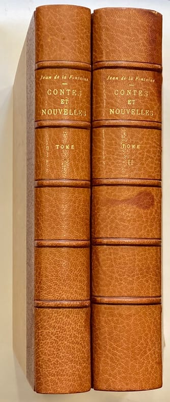 Paris A. Le Vasseur et Cie, éditeurs 1894 in 12 (17x12) 2 volumes reliures à la bradel demi maroquin rouge de l'époque, dos lisses ornés d'un grand fer doré de style "romantique", têtes dorées, papier vergé. Tome 1: Contes et nouvelles en vers de Jean de la Fontaine, portrait en frontispice, IV et 268 pages. Jean de La Fontaine, 1621-1695. Tome 2: Recueil des meilleurs contes en vers, Contes et nouvelles en vers par Grécourt, Saint-Lambert, Champfort, Piron, Dorat, La Monnoye et François de Neufchâteau, 210 pages. Collection ''Les Conteurs galants des XVIIe et XVIIIe siècles''. Edition illustrée de vignettes en noir et blanc gravées par Duplessis-Bertaux. Bel exemplaire ( Photographies sur demande / We can send pictures of this book on simple request )