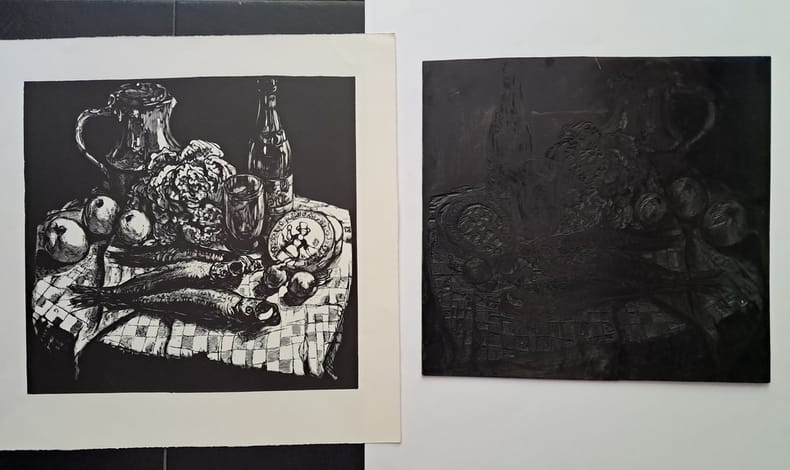 Gravure en noir (465 x 455 mm), avec sa matrice en plastique.