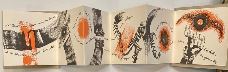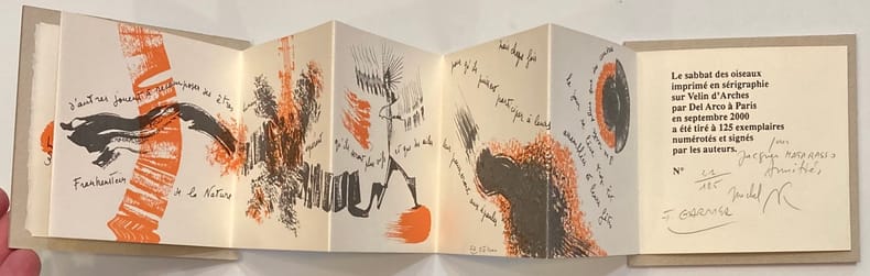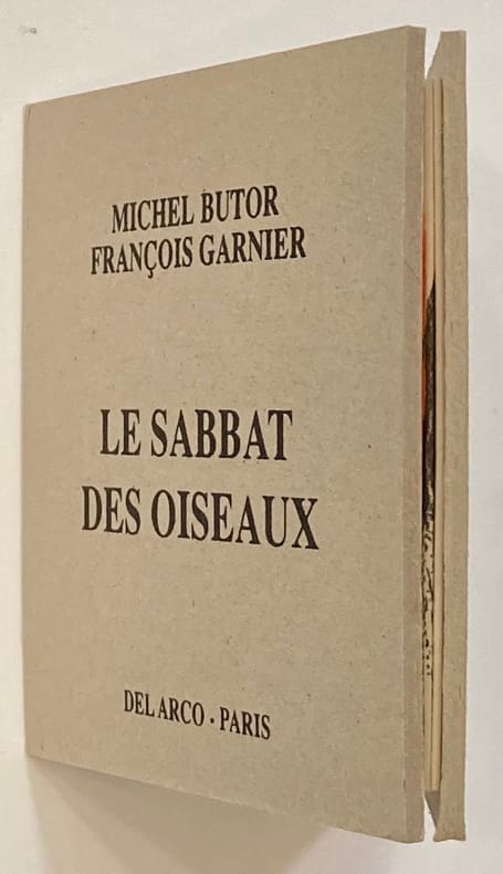 Edition originale de ce texte de Michel Butor, illustrée de sérigraphies en noir et orange de François Garnier, dans lesquelles l'écriture et l'illustration se mélangent.1 des 125 exemplaires sur vélin d’Arches recto-verso, numérotés et signés par l'auteur et l'illustrateur.Exemplaire de Jacques Matarasso, enrichi d’un envoi autographe signé : « Pour Jacques Matarasso. Amitiés, Michel Butor. ». Michel Butor collaborera plusieurs années avec Jacques Matarasso, célèbre libraire parisien puis niçois, pilier moteur de l’Ecole de Nice.